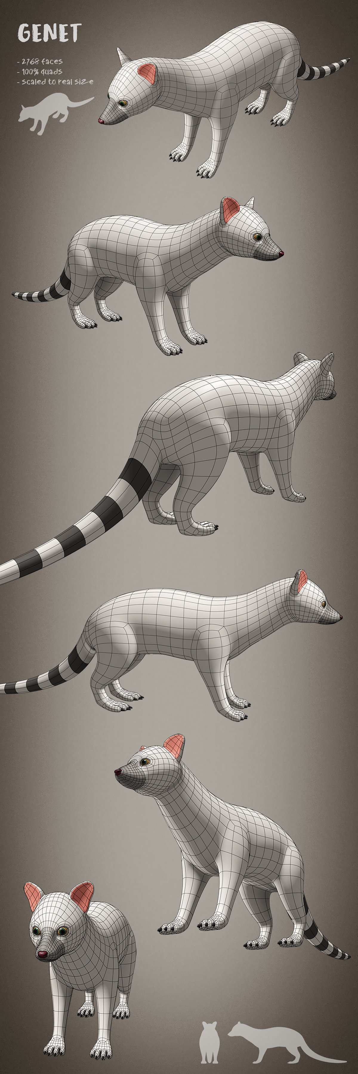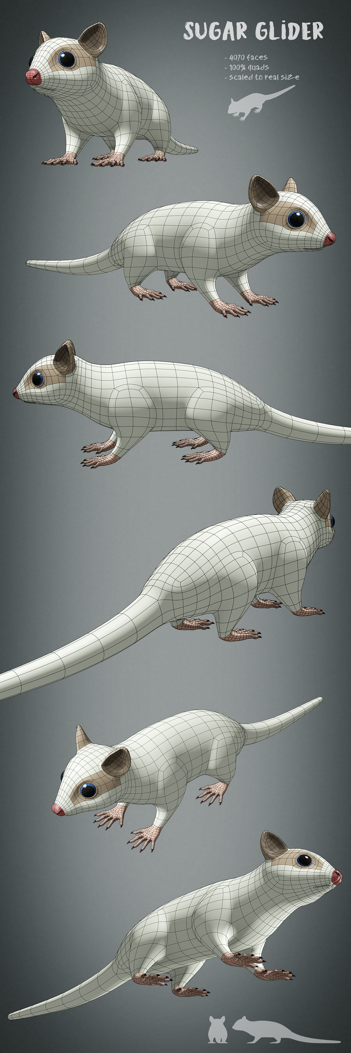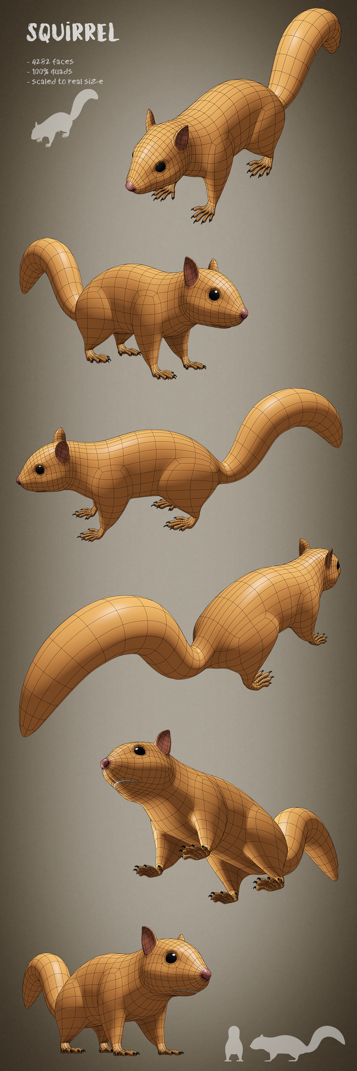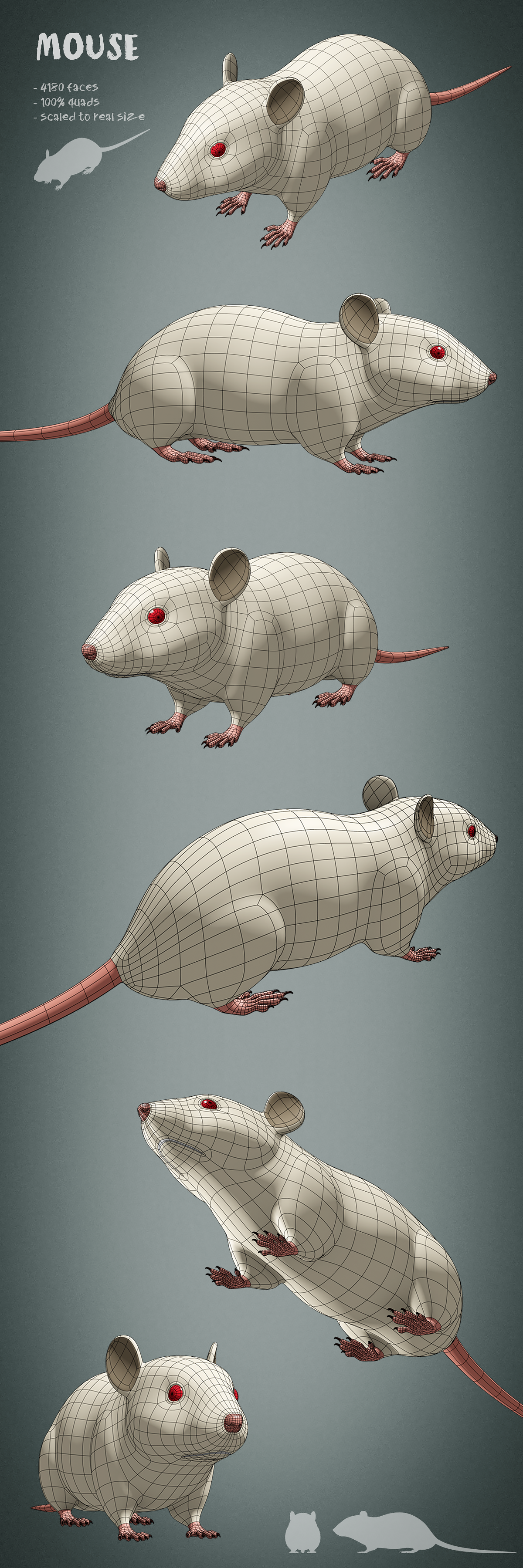 - uniform number of loop cuts in each model (8 for ears, legs, eye sockets, and tails, 24 for a body)