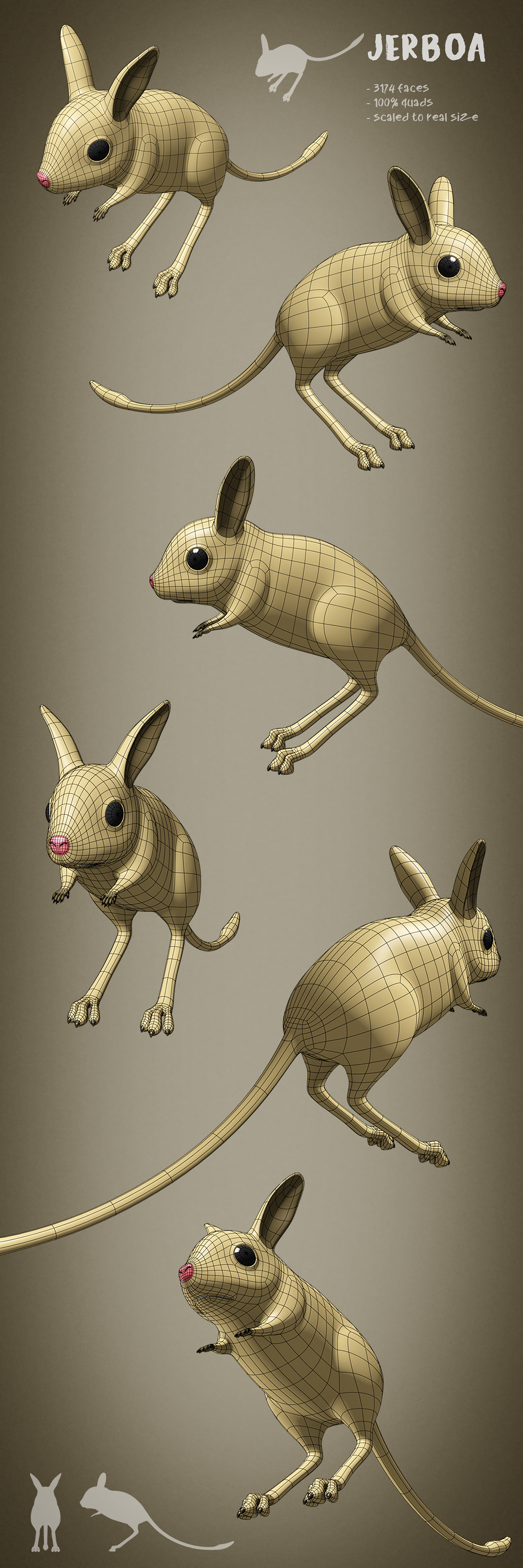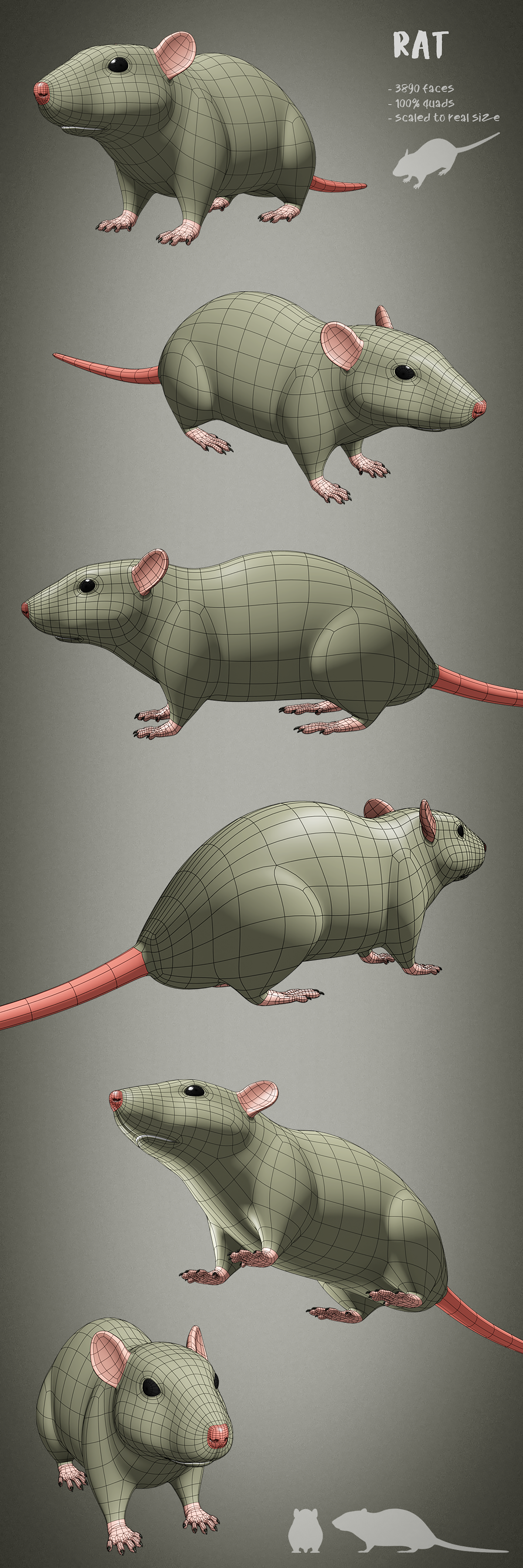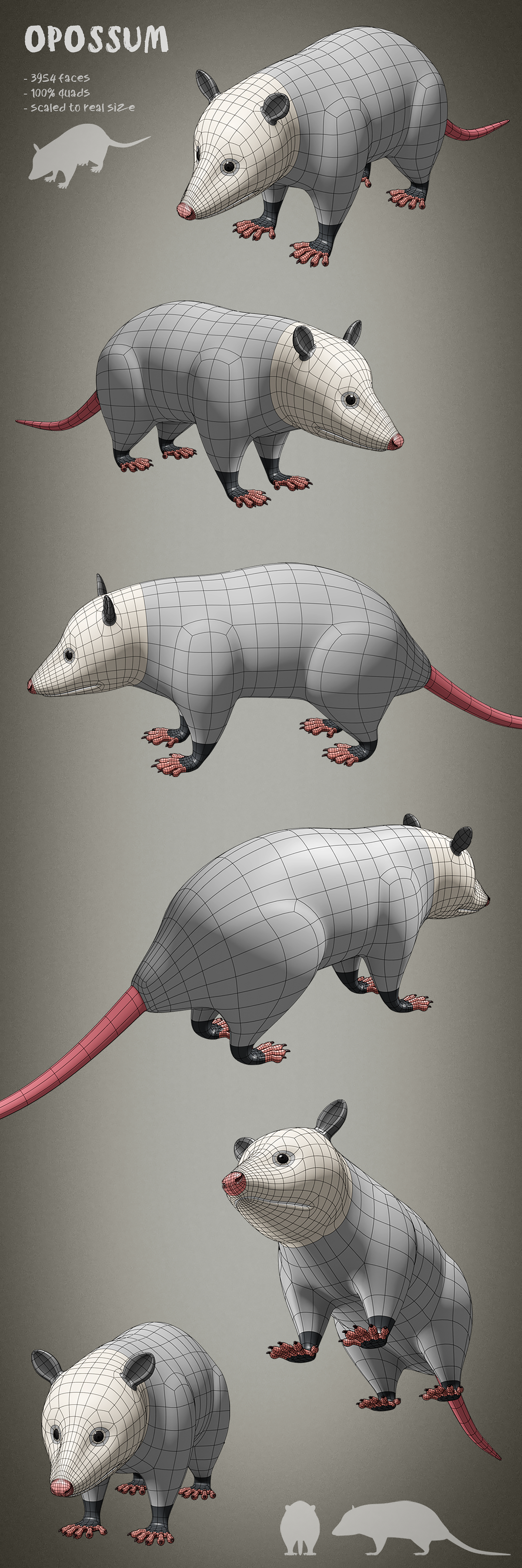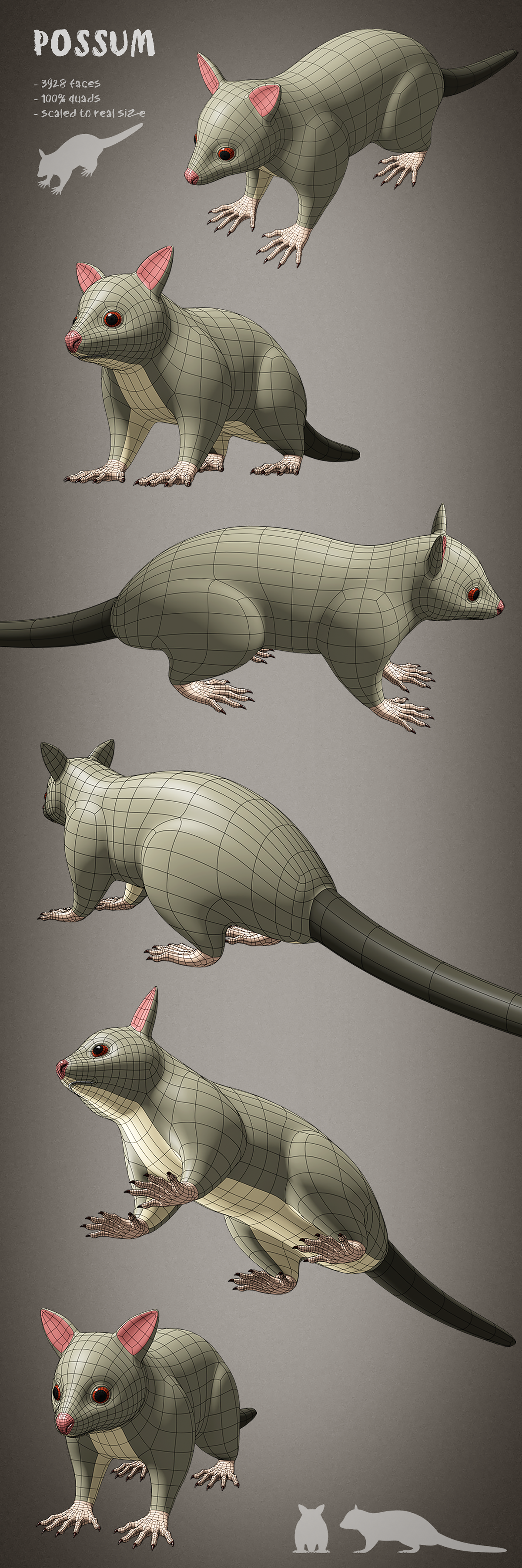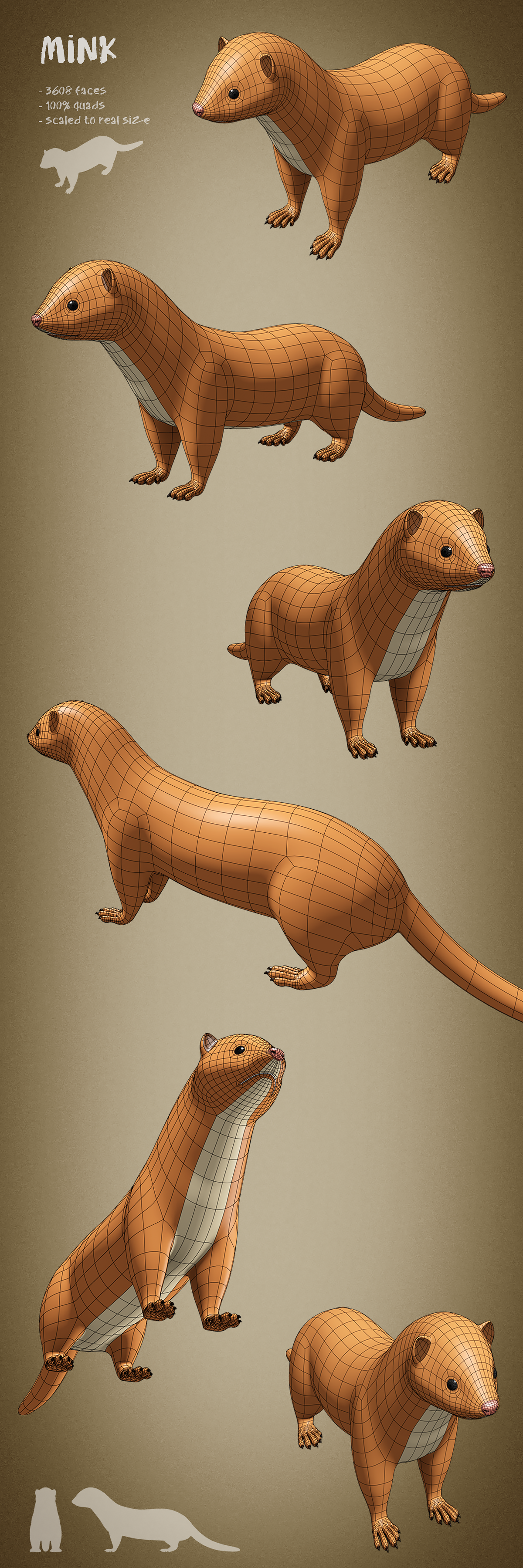 - uniform number of loop cuts in each model (8 for ears, legs, eye sockets, and tails, 24 for a body)