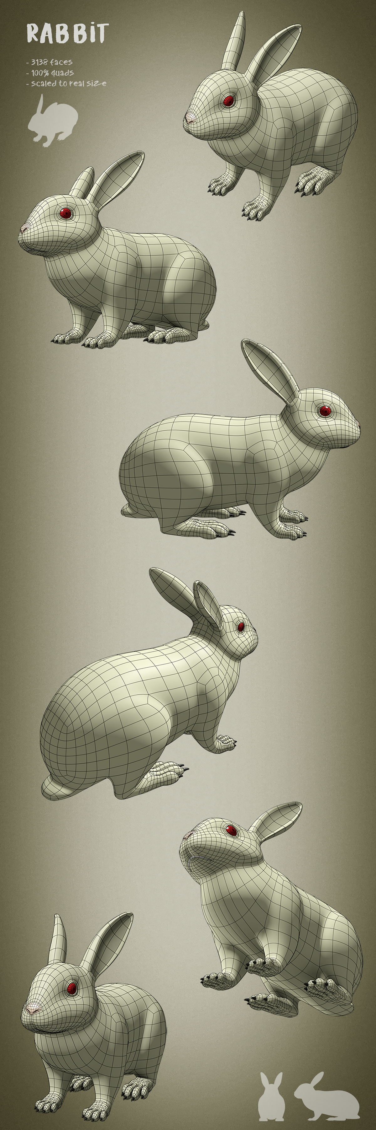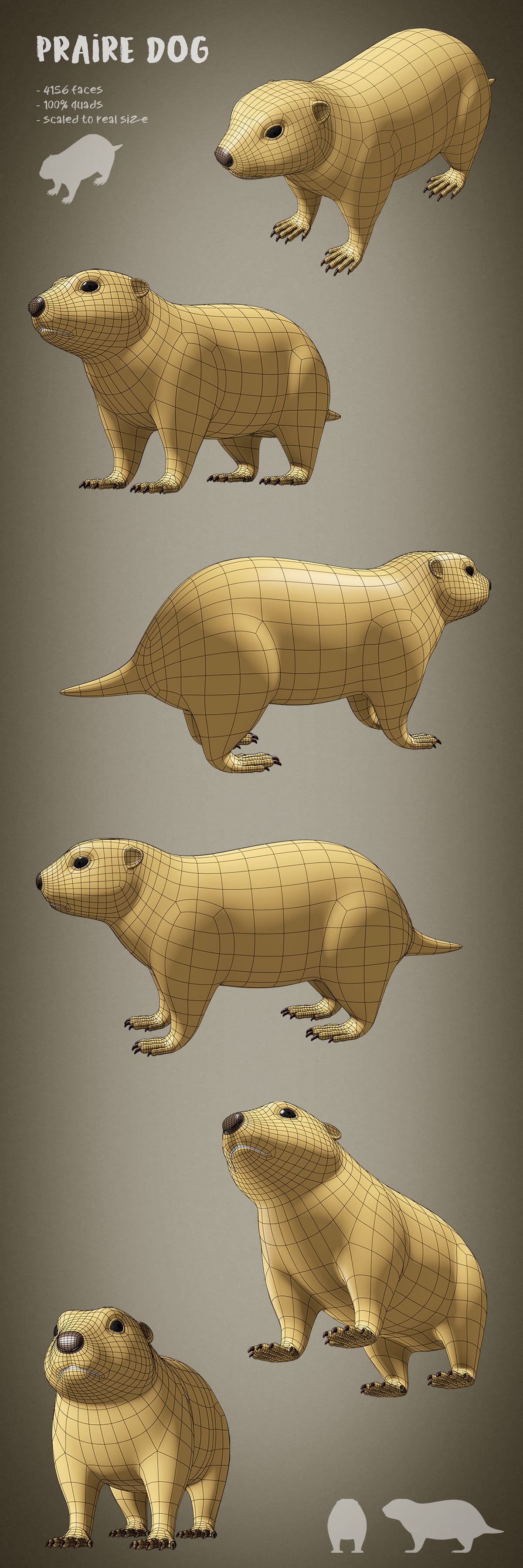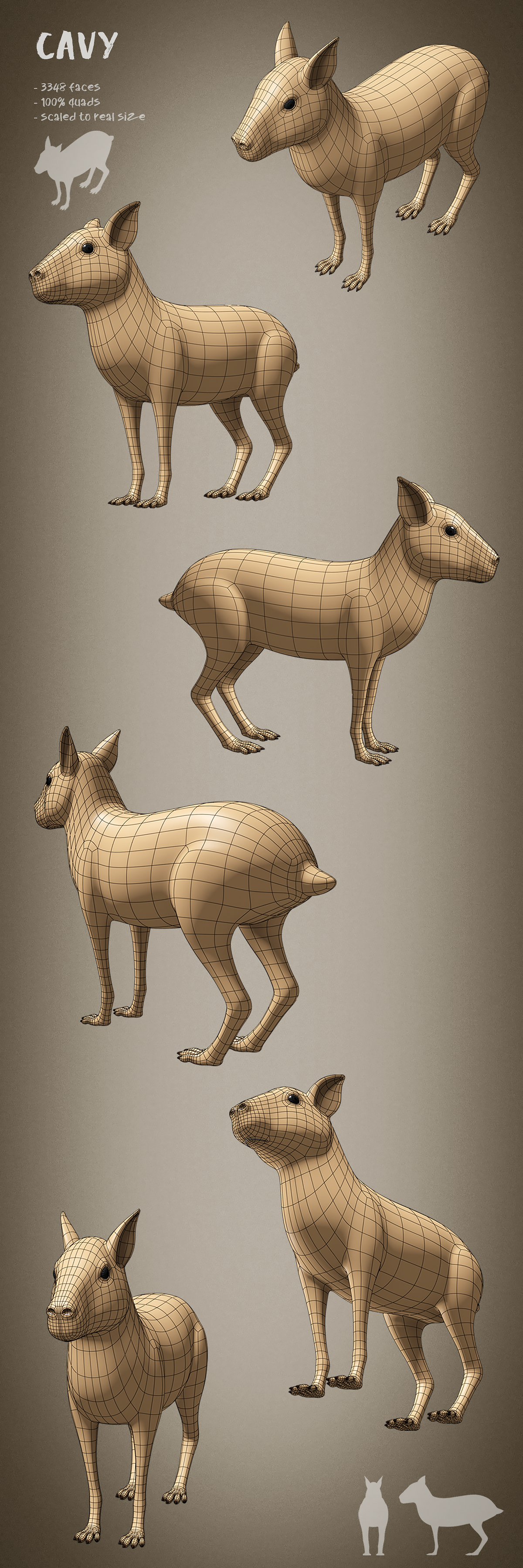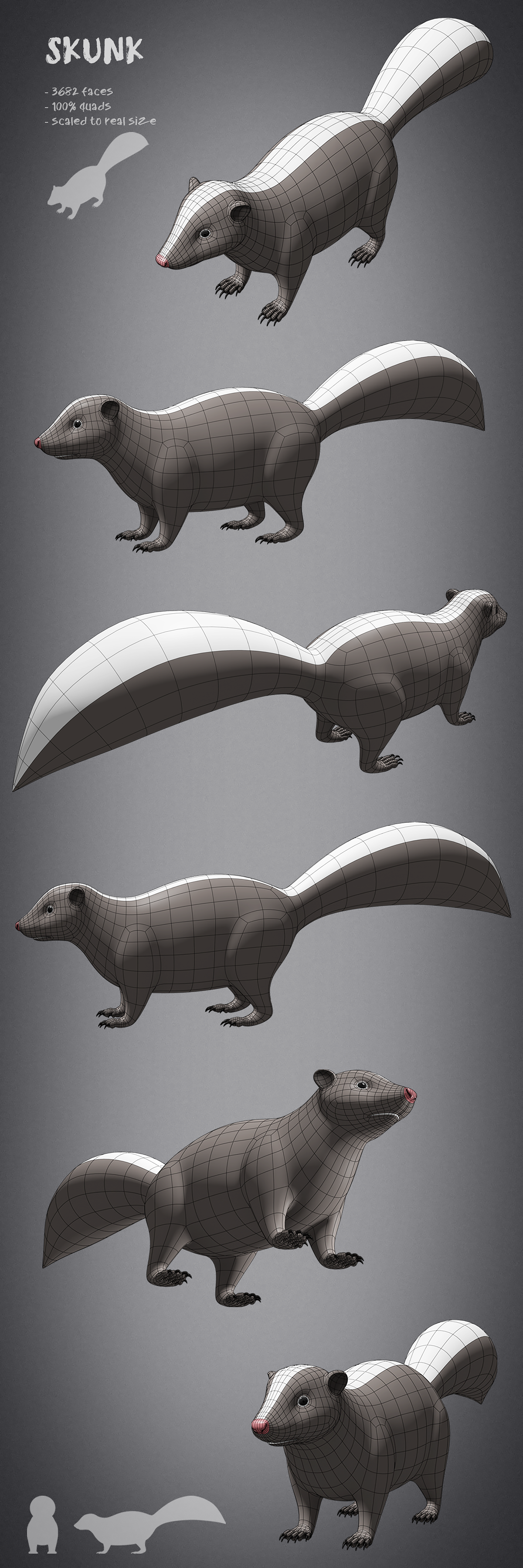 - uniform number of loop cuts in each model (8 for ears, legs, eye sockets, and tails, 24 for a body)