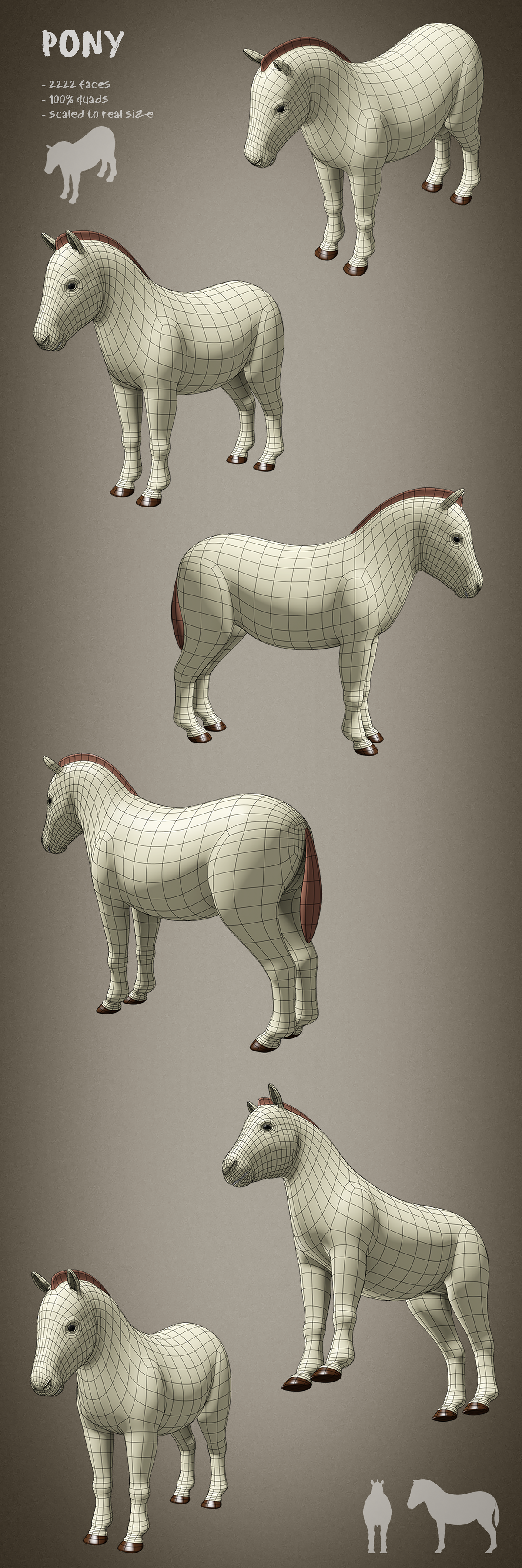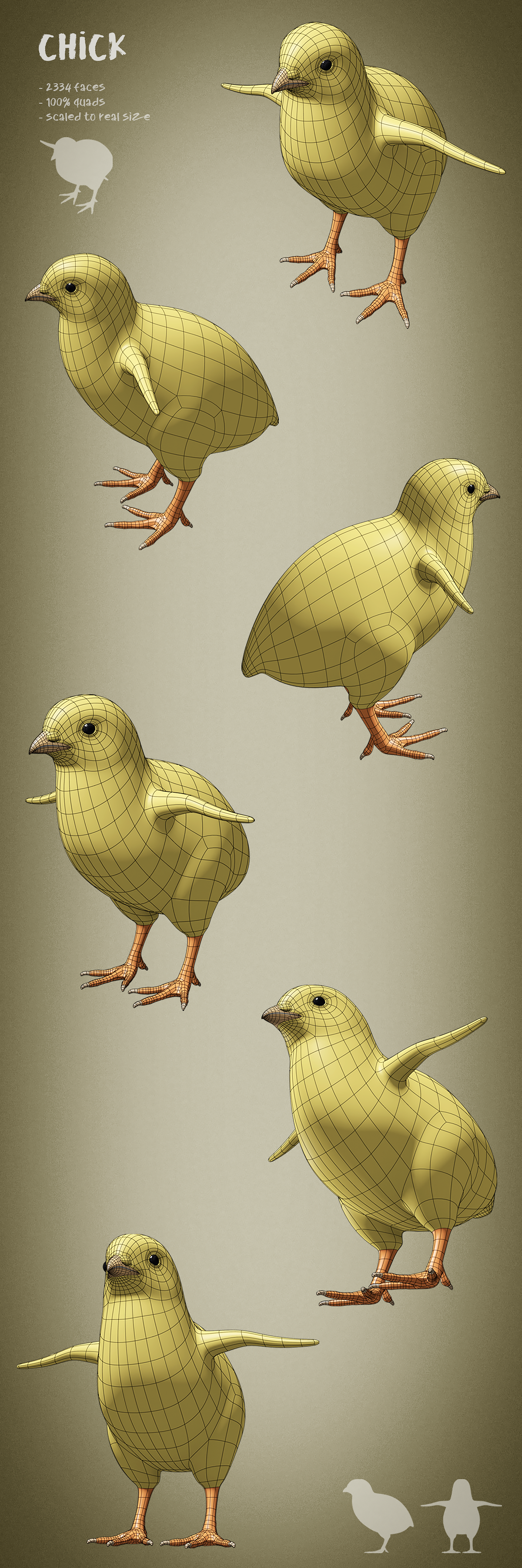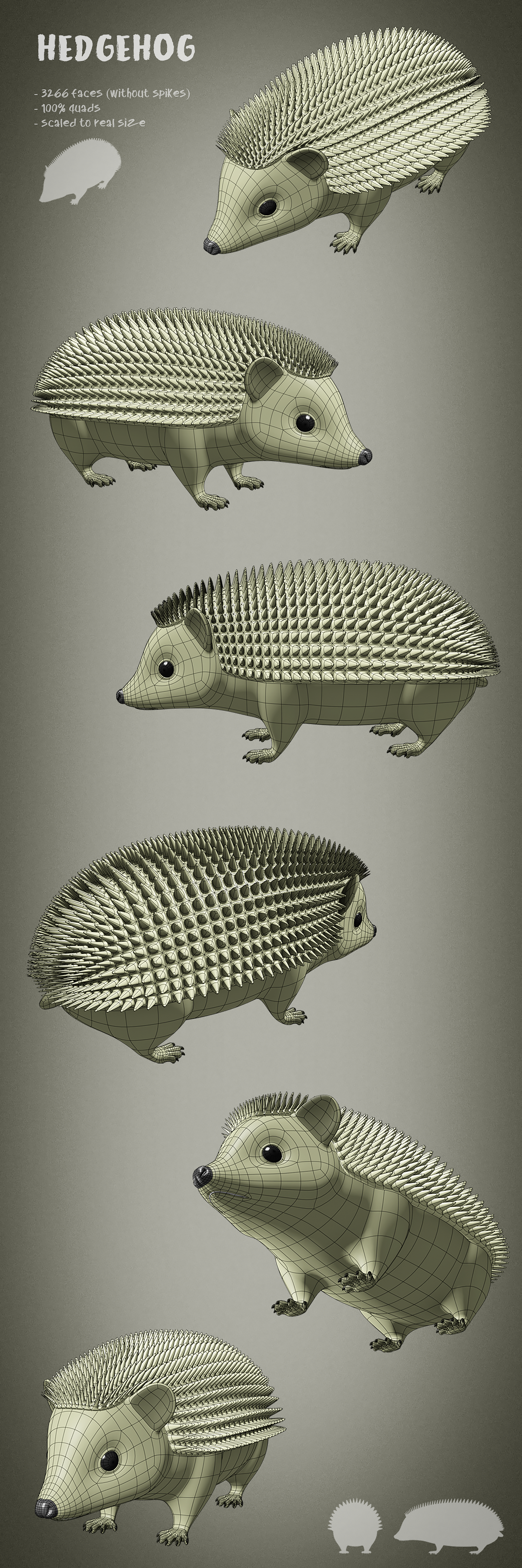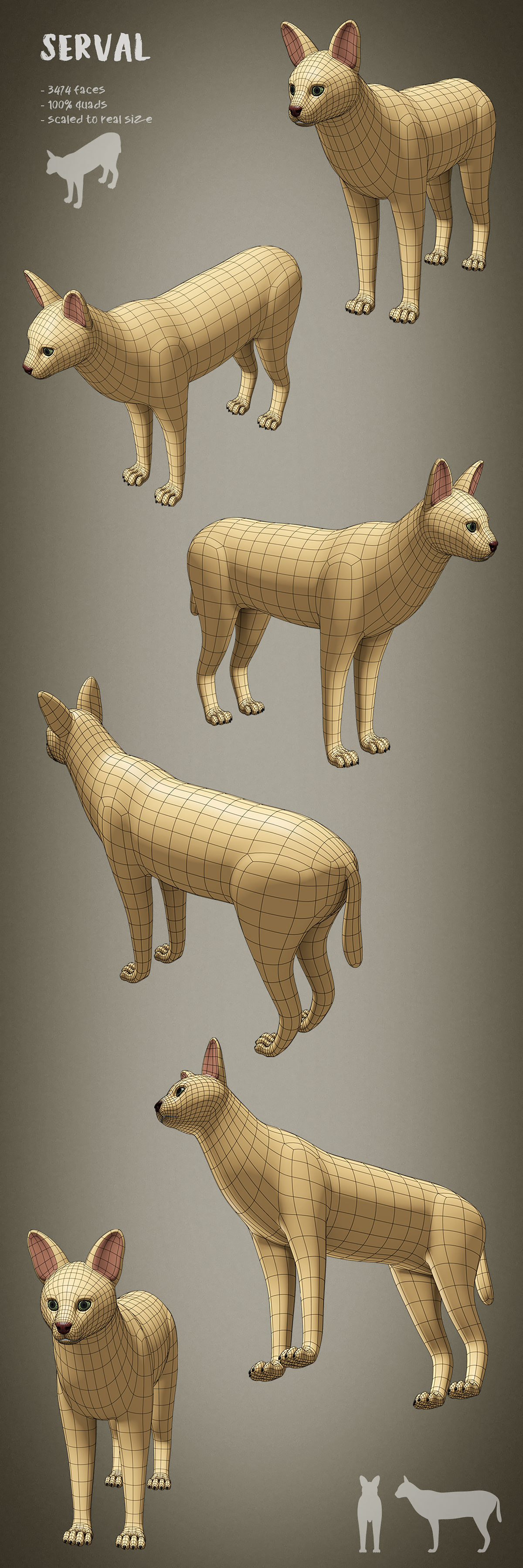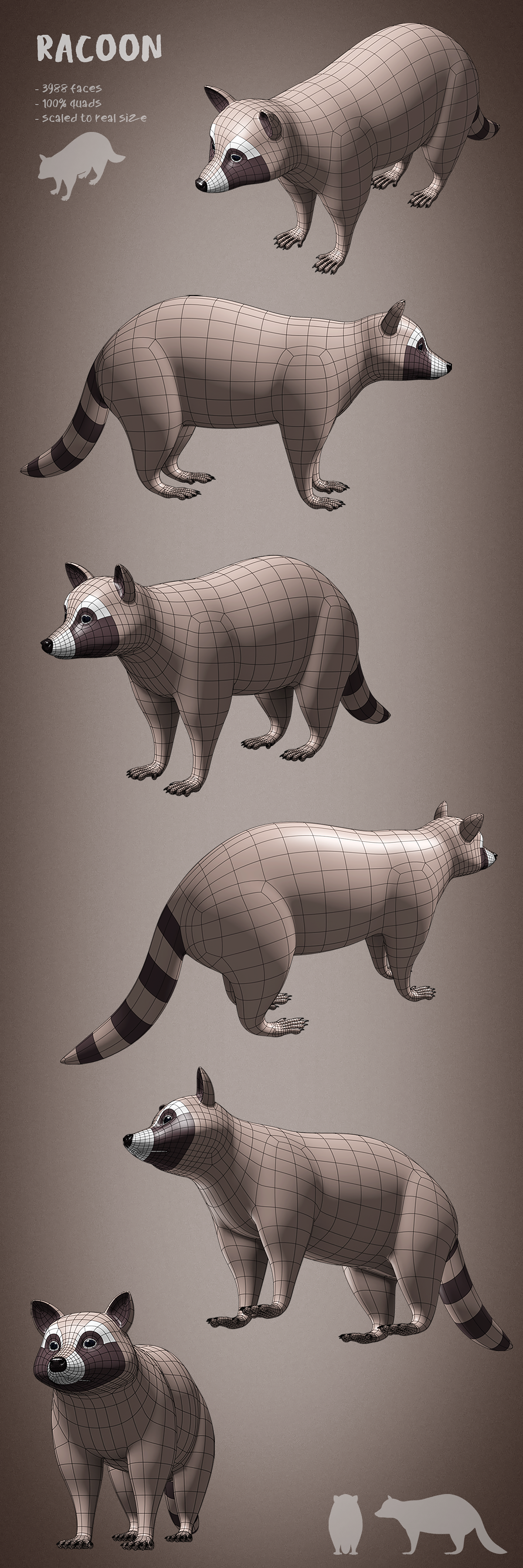 - uniform number of loop cuts in each model (8 for ears, legs, eye sockets, and tails, 24 for a body)