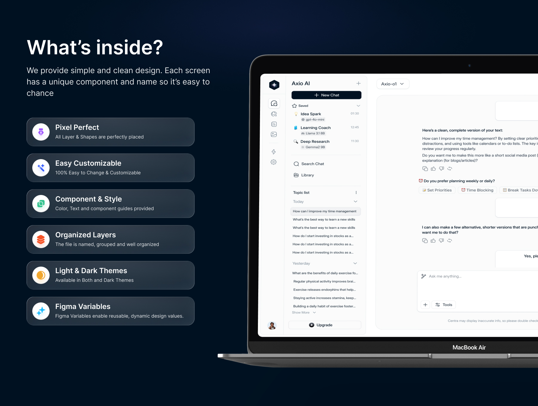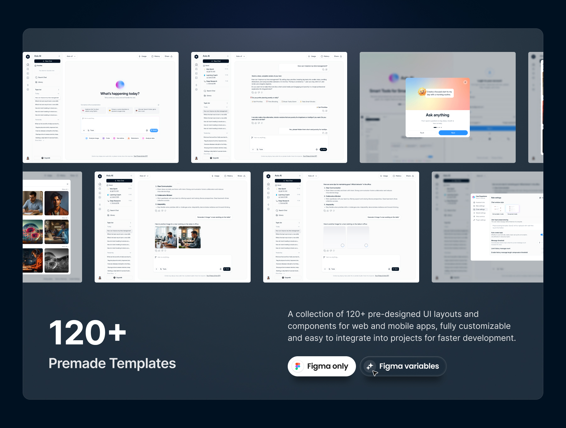With 120+ meticulously crafted screens, AXIO·ai is fully optimized for Figma Auto-Layout and responsive design. It includes Light & Dark modes, Figma variables, and a comprehensive style guide — ensuring a scalable and consistent design system for any AI product.