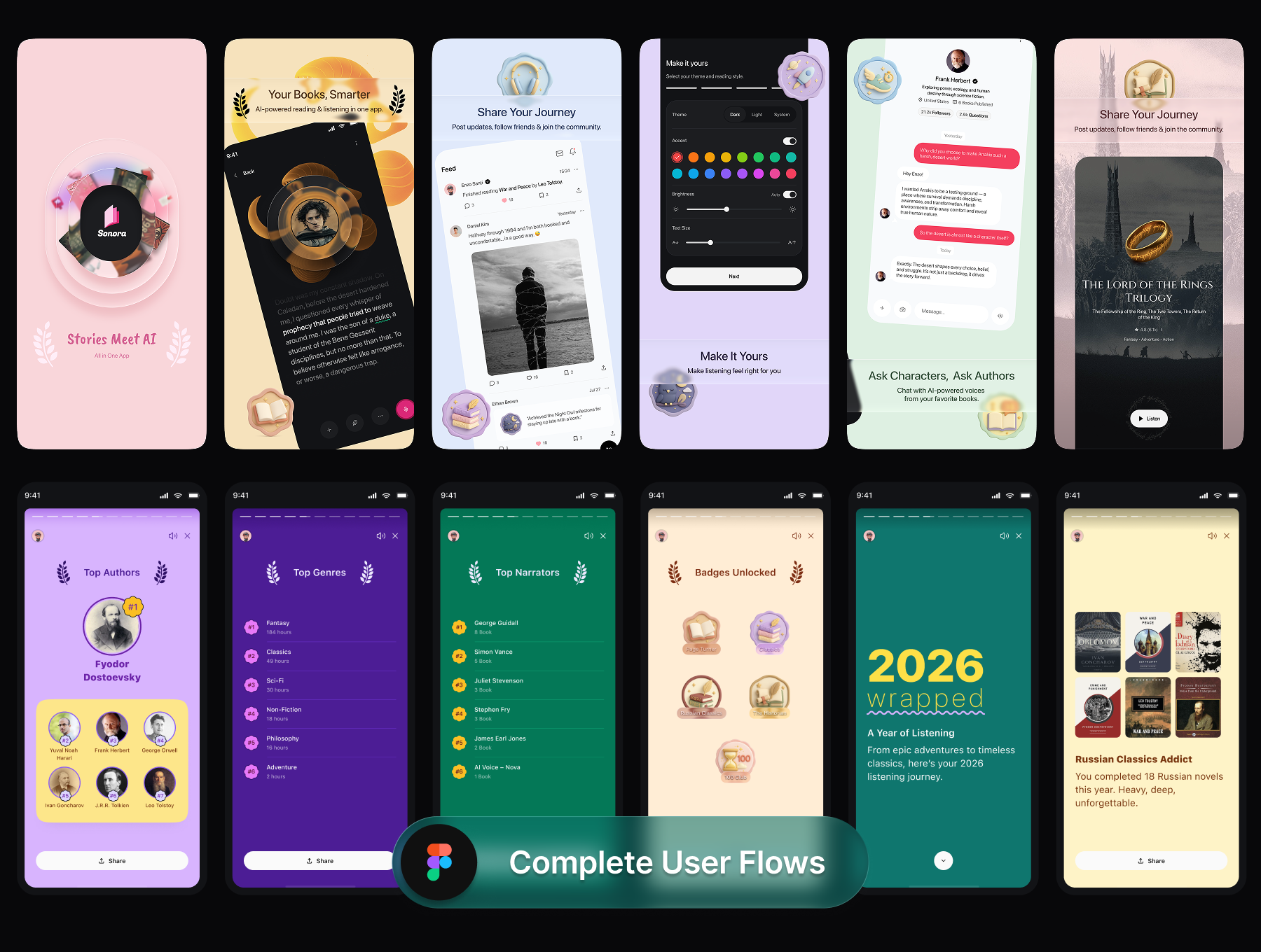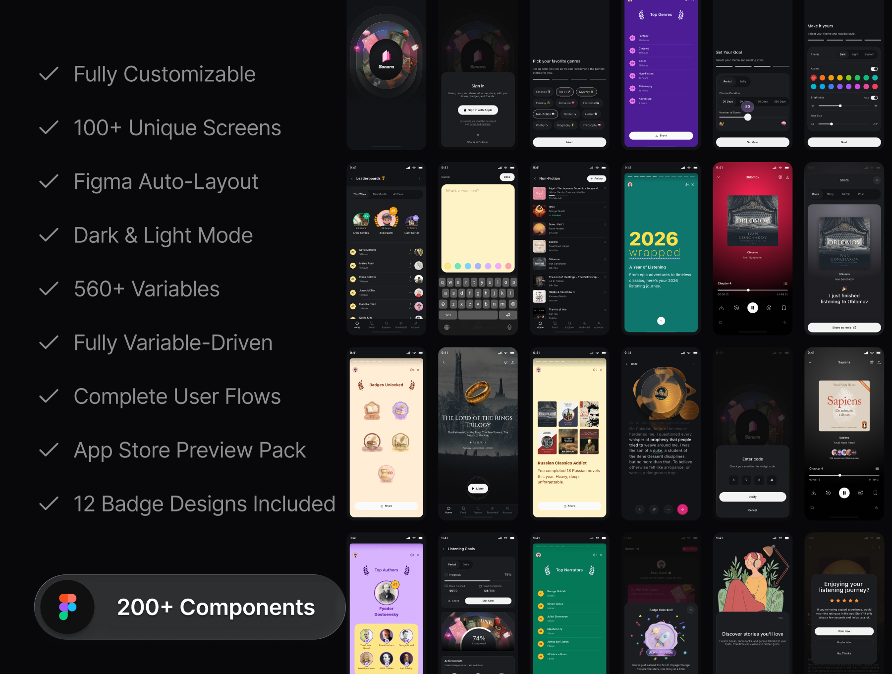 A complete mobile design system built to cover every part of the audiobook experience. With over 100 carefully designed screens, 200+ components, and 560+ variables, this kit is fully customizable and ready to scale.