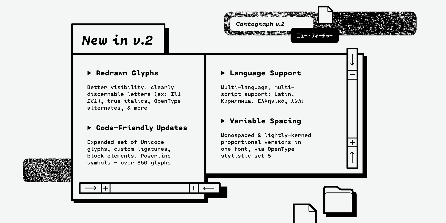 A monospaced typeface with character and warmth, Cartograph© CF is a handsome font family featuring a lush, cursive italic, code-friendly ligatures, and a proportional set accessible via OpenType. A tribute to the utilitarian beauty of terminals and typewriters, Cartograph excels in both code and prose.