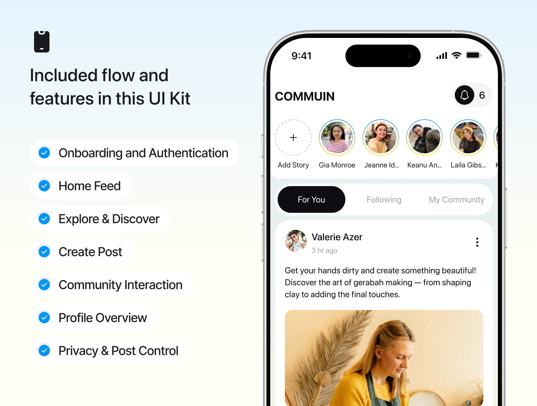 This is a modern mobile app UI kit designed for building community and social media platforms. With over 50 ready-to-use screens, it helps you create smooth user experiences for onboarding, posts, community interaction, and more.