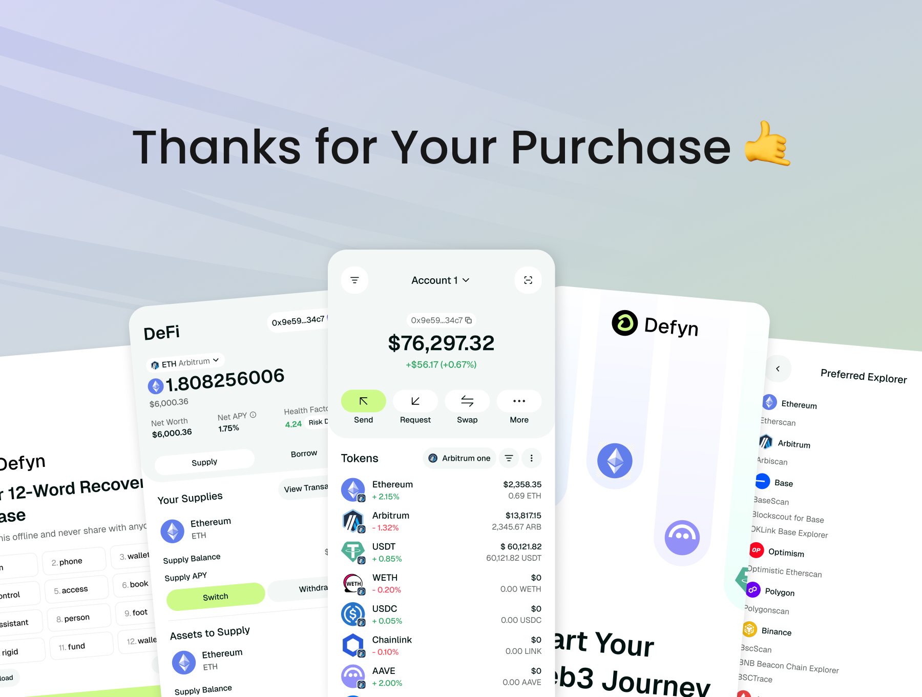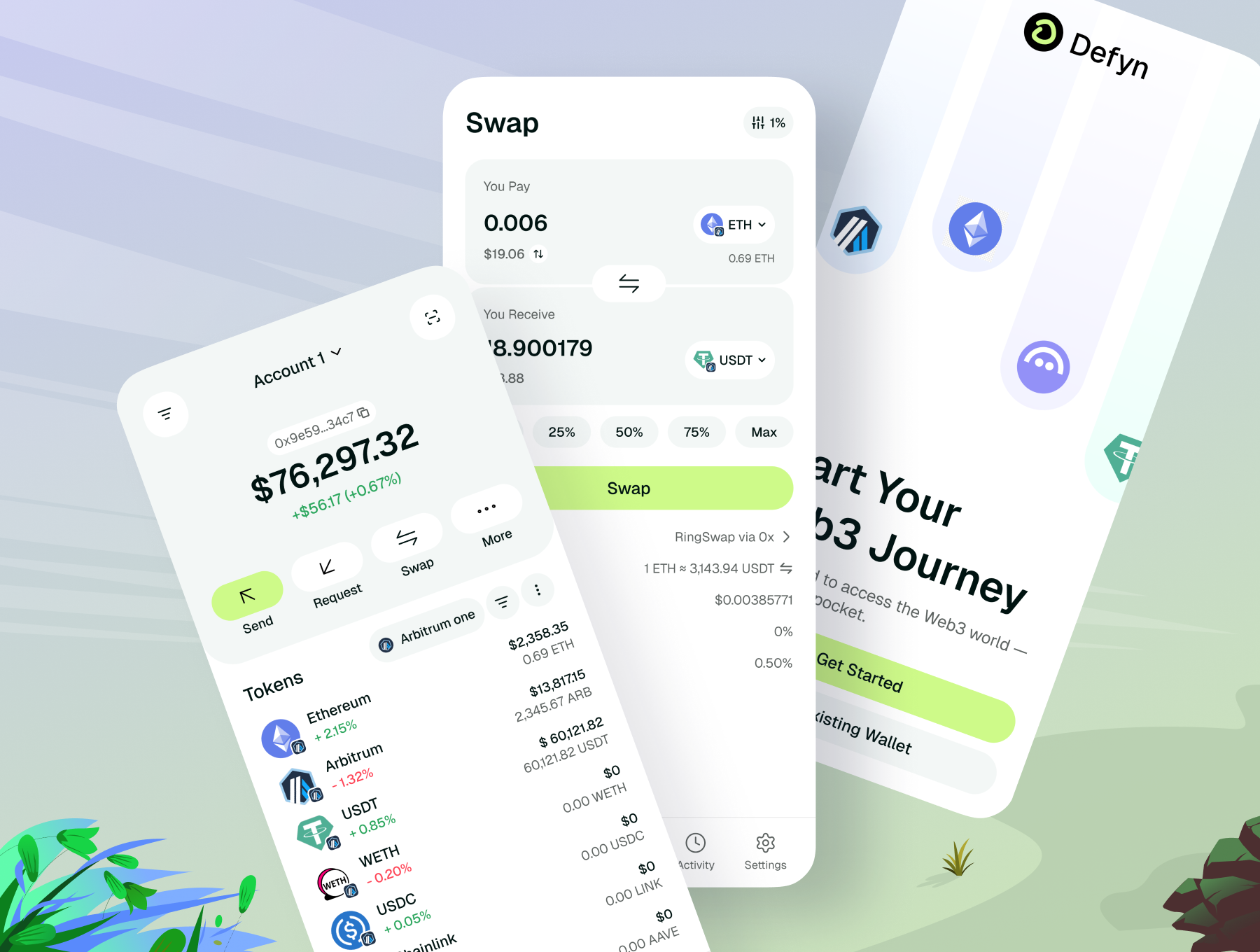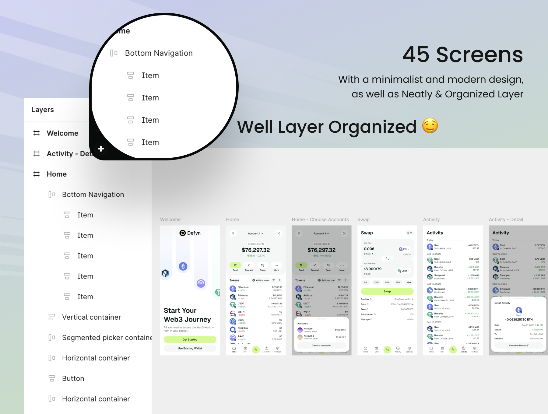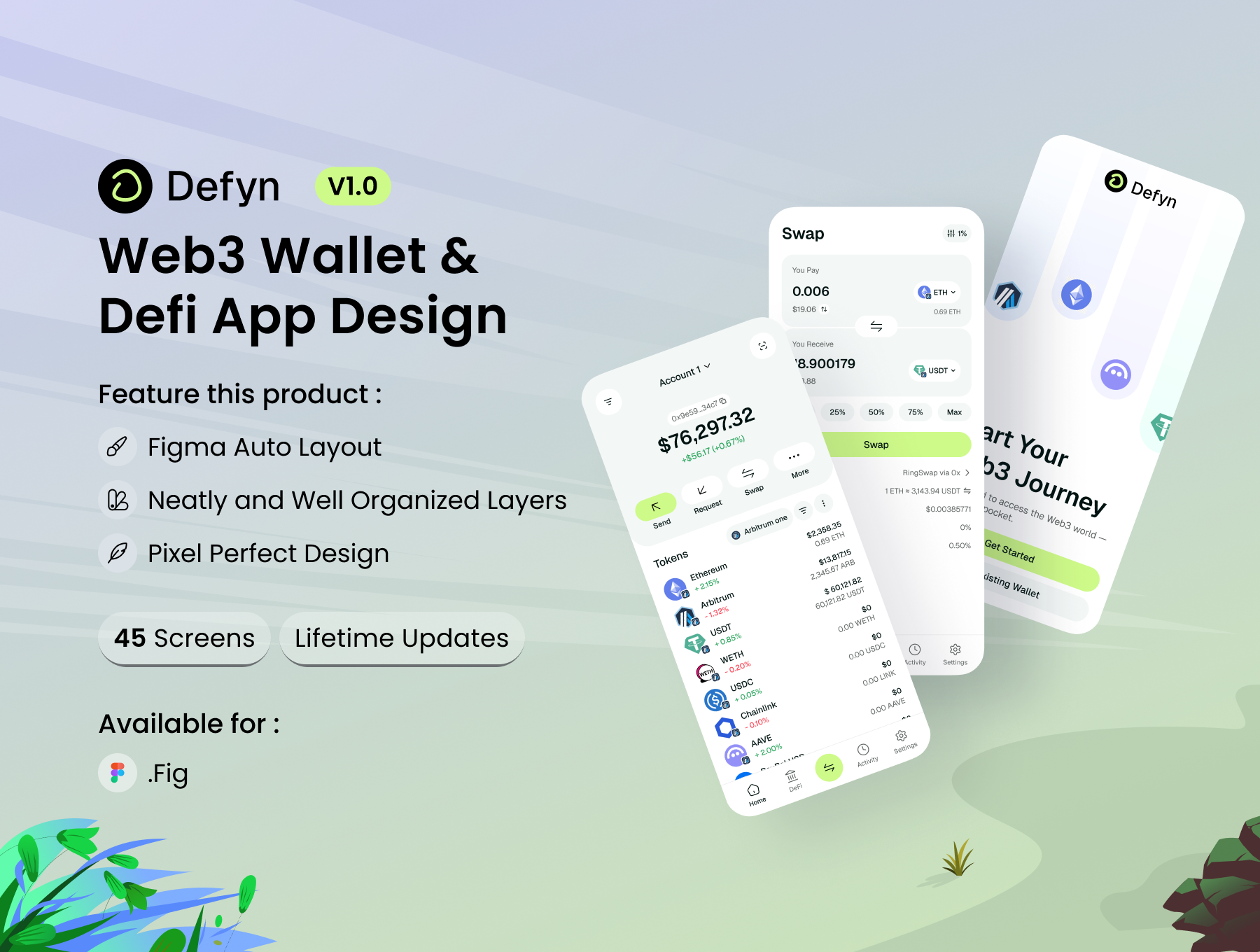 Defyn is a modern Web3 wallet and DeFi app designed with simplicity, security, and speed in mind. Built for those who want seamless access to decentralized finance, Defyn offers a sleek, intuitive interface for managing crypto assets and DeFi activities. Whether you're sending tokens, staking, or exploring new opportunities, Defyn ensures a smooth experience for crypto enthusiasts. With 40 meticulously designed screens, it's the perfect UI kit for developers and designers who aim to create a professional and user-friendly DeFi wallet app.