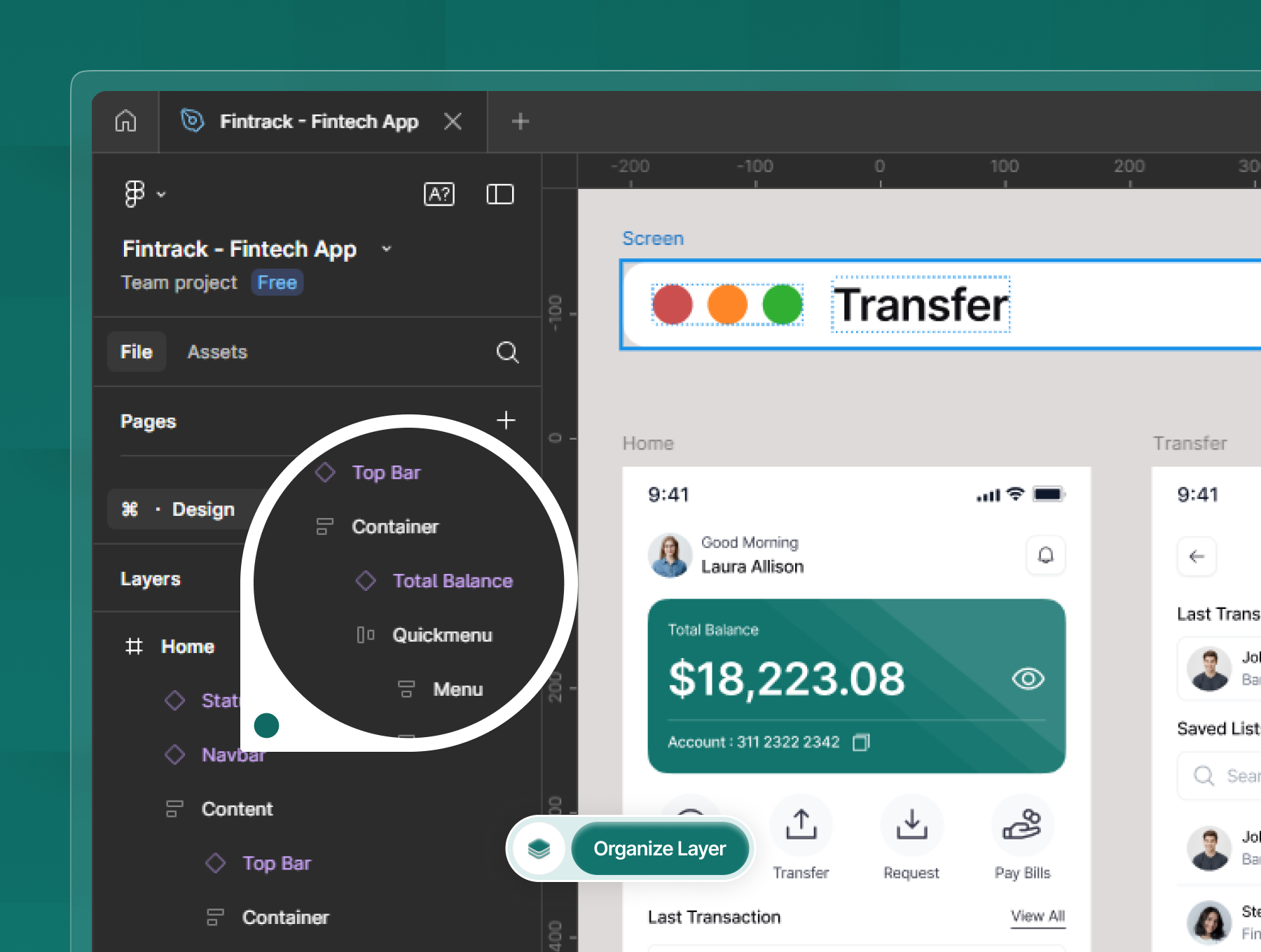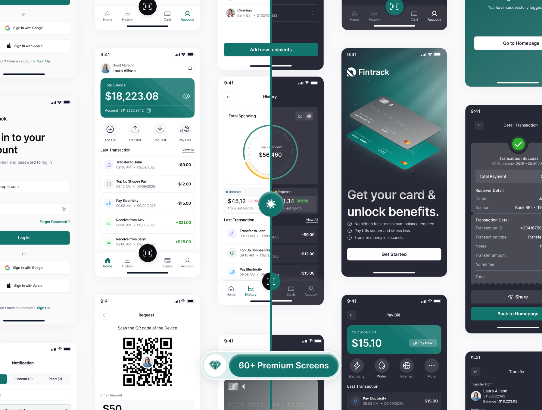 With 60+ editable screens in Figma, available in both light and dark modes, Fintrack provides all key user flows, from onboarding and authentication to home, transfers, top-ups, QR payments, transaction history and more. Each screen is carefully built with smart components, auto layouts, and consistent spacing for seamless customization and scalability