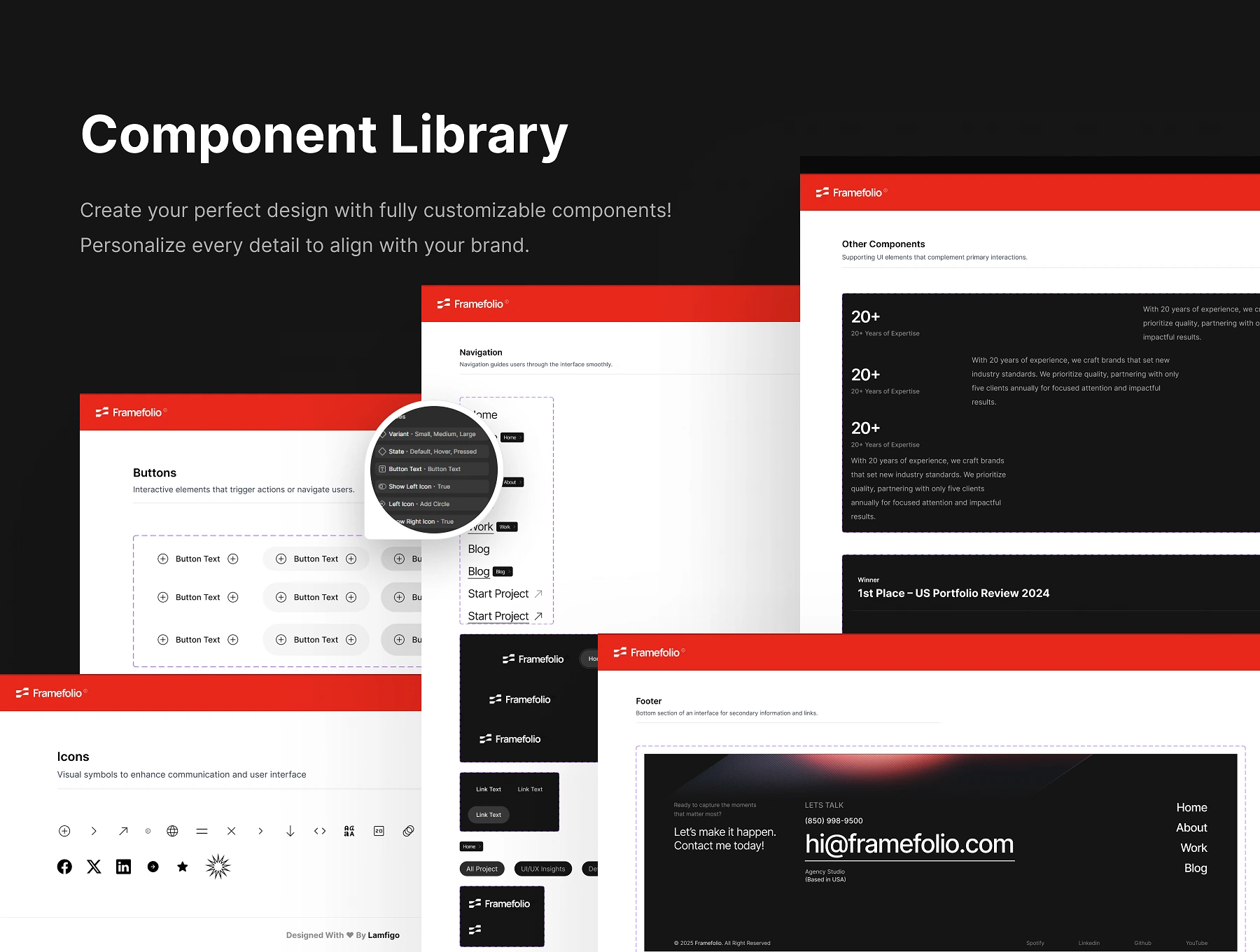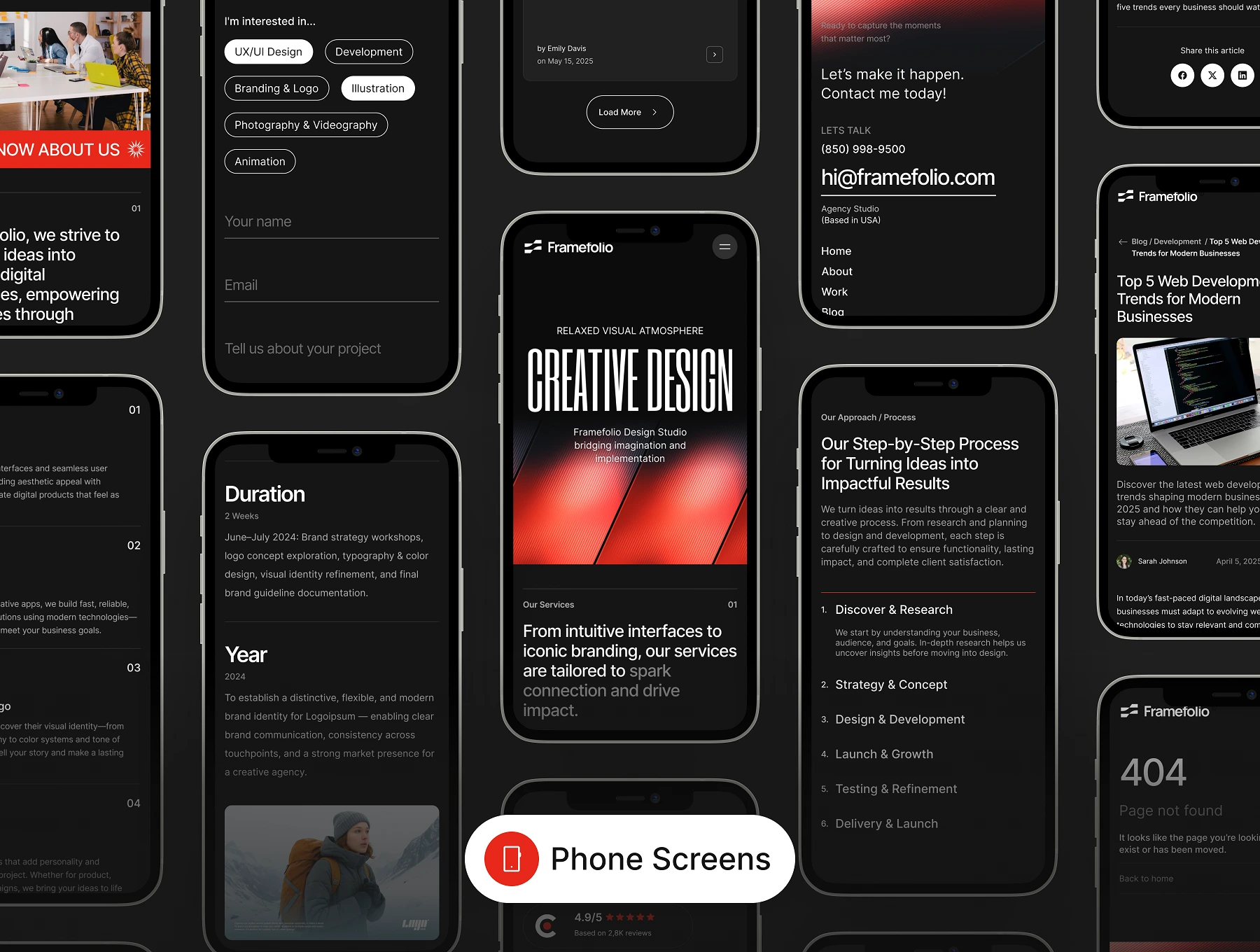 Framefolio includes 20+ carefully designed screens across 8 essential pages (Home, About, Project, Project Detail, 404, Contact, Blog, and Single Blog). Each page comes with desktop, tablet, and phone versions for full responsiveness. With 95 components and a fully organized system, every element is designed for clarity, flexibility, and customization.