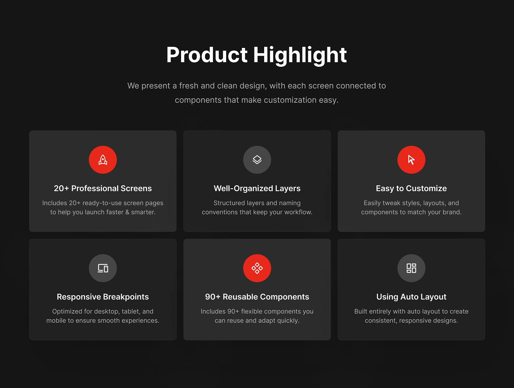 The UI Kit leverages Figma’s auto layout, structured layers, and detailed documentation—including typography scales, color systems, and responsive breakpoints—so you can move from design to development with ease.