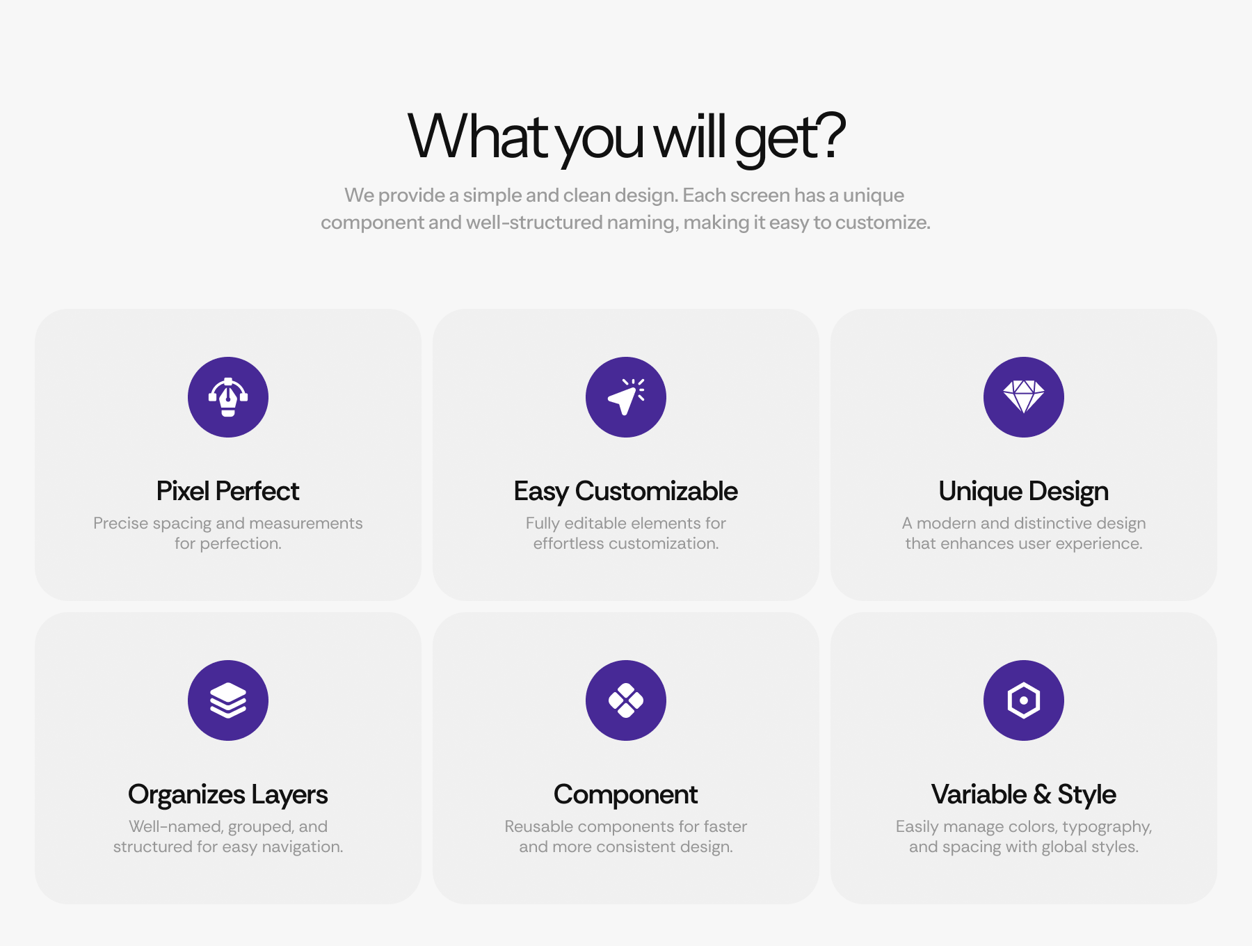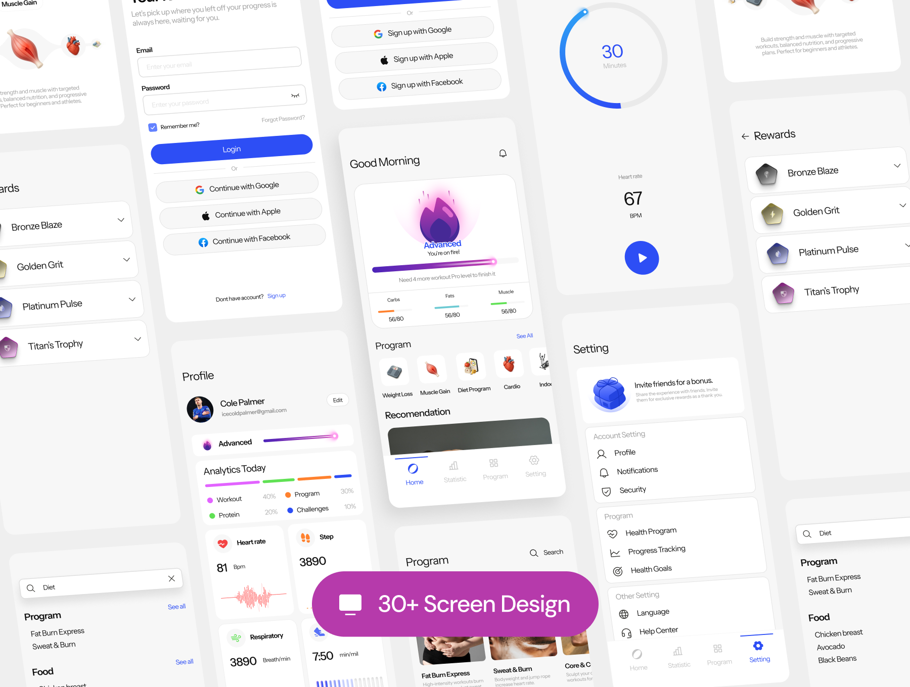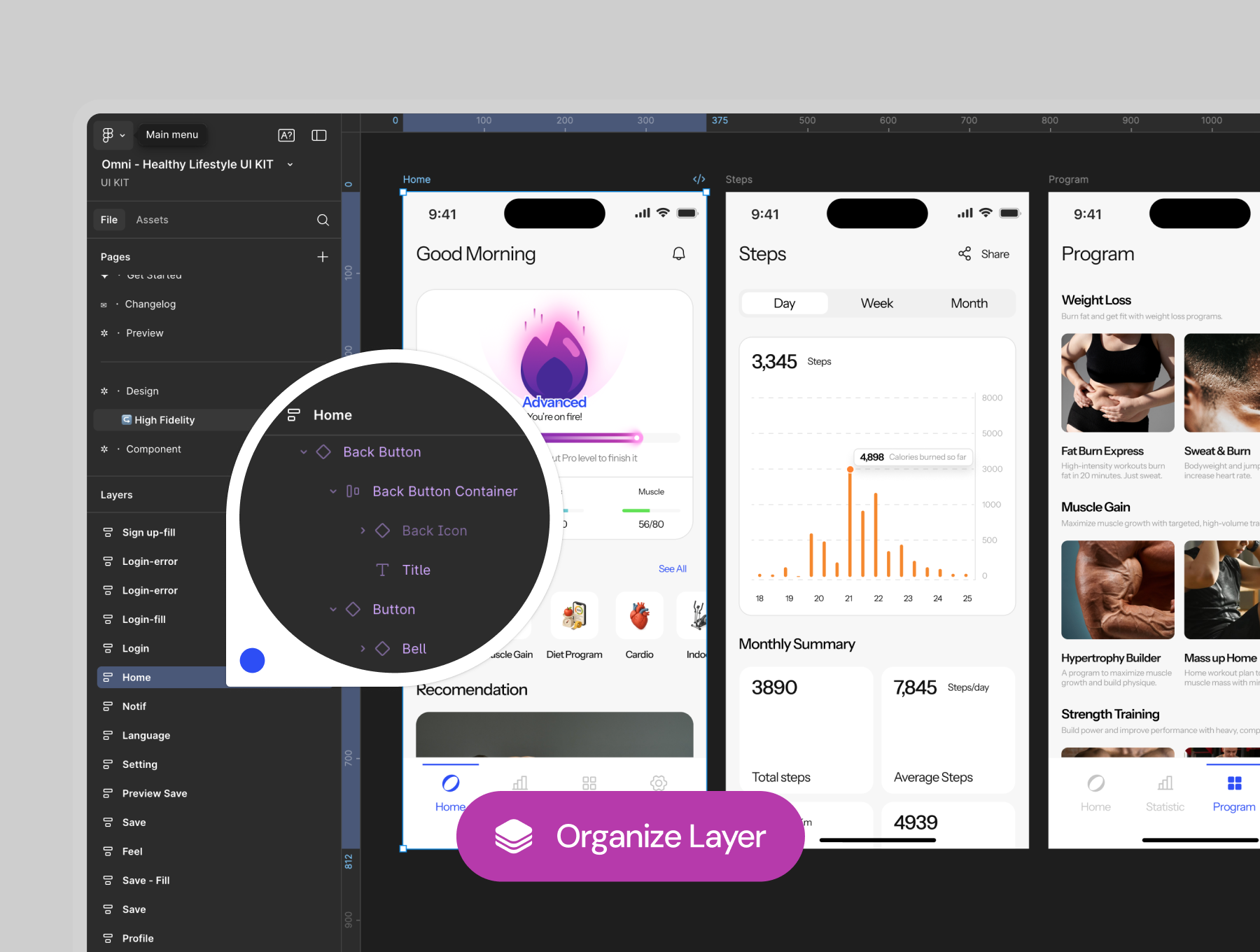 With 30+ editable screens in Figma, every layout is built with scalable components, smart auto-layouts, and well-organized layers perfect for designers and product teams who want to build health focused apps quickly without sacrificing aesthetics or usability.