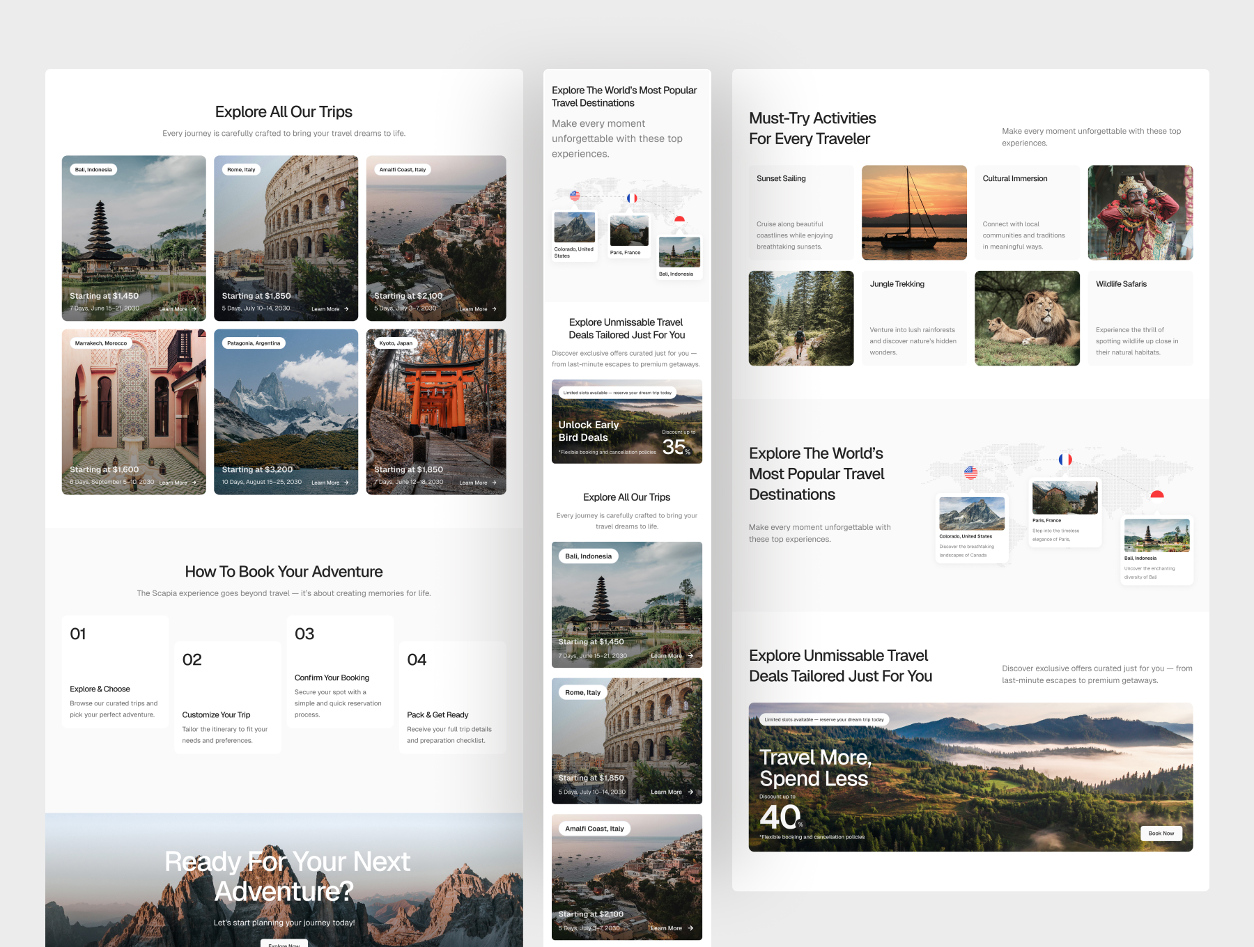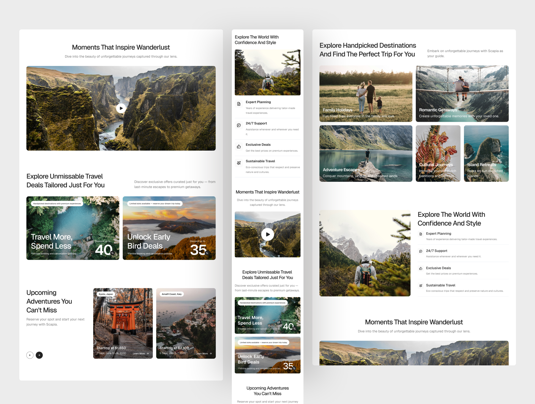 Scapia is more than just a beautiful travel website—it’s a functional marketing tool. Every section is purposefully designed to guide users through a smooth flow: inspire them visually, help them browse by interest, then drive them to inquire or book. Whether you’re spotlighting early bird deals, romantic destinations, or expert-led tours, Scapia makes sure your message is delivered with clarity and style.