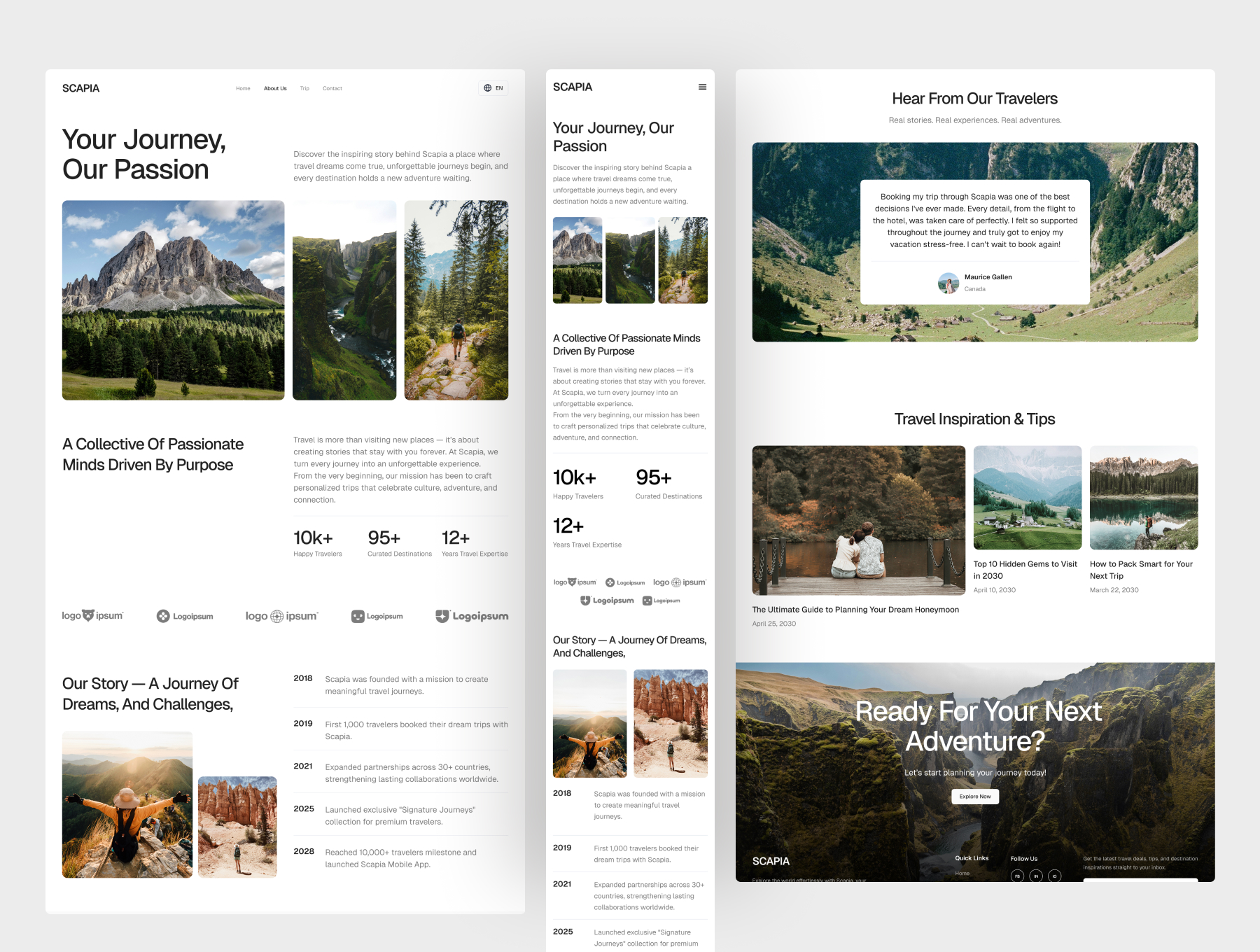 - + Visual Storytelling: Testimonial blocks, blog teasers, and wanderlust-driven photo sections bring human warmth and emotional appeal to the design.