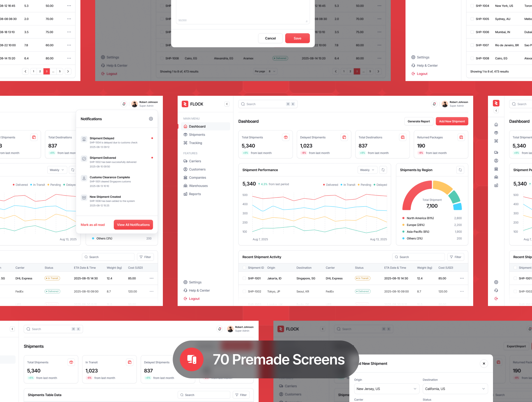 This is a collection of pre-designed UI components, layouts, and data visualization templates tailored for digital platforms that manage shipments, carriers, warehouses, customers, and logistics performance.