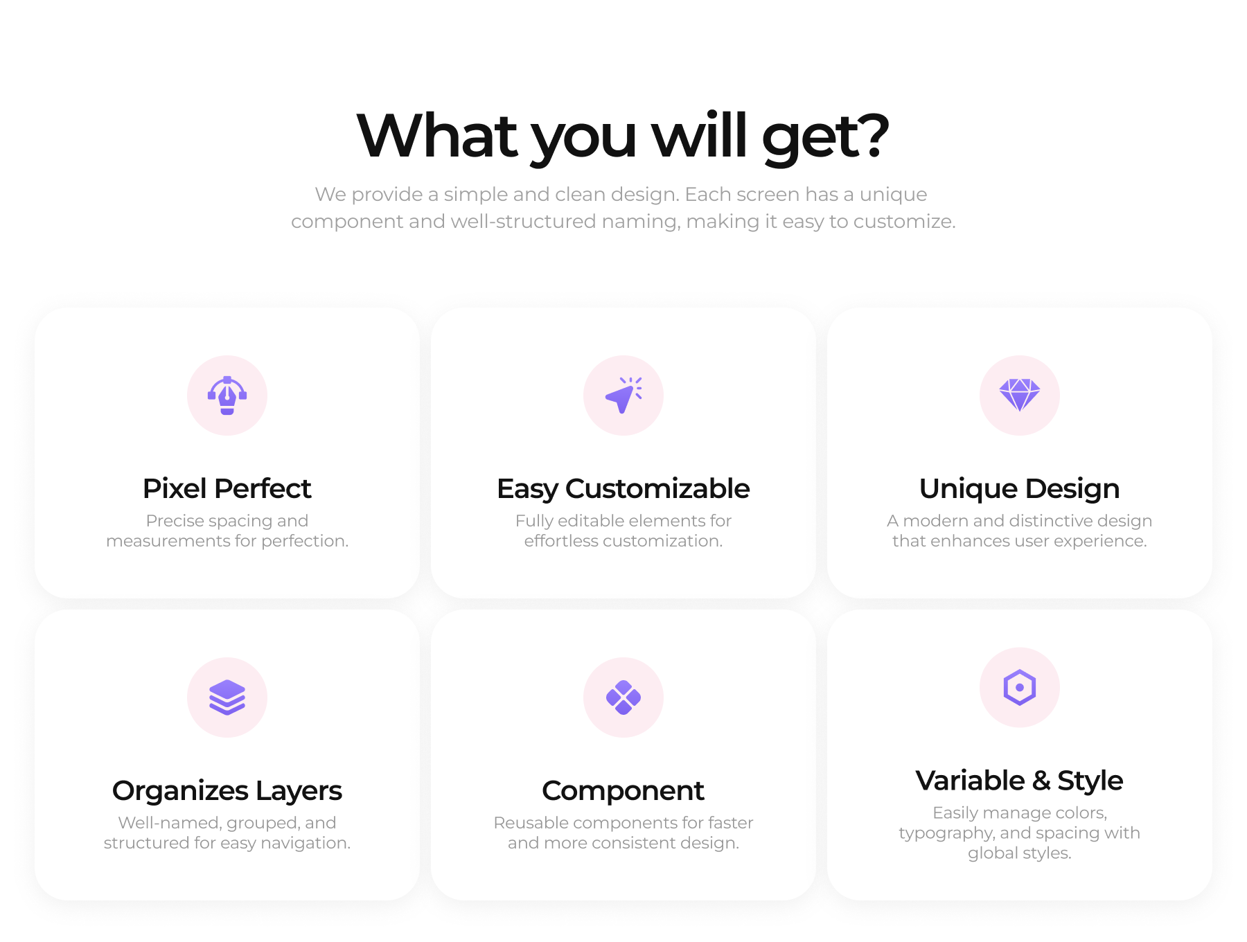 This UI Kit is fully optimized with Figma-native features like Auto Layout, reusable components, typography scales, and flexible spacing systems. Every element is built with customization in mind—making it easy to adapt to your product’s voice, branding, and goals.