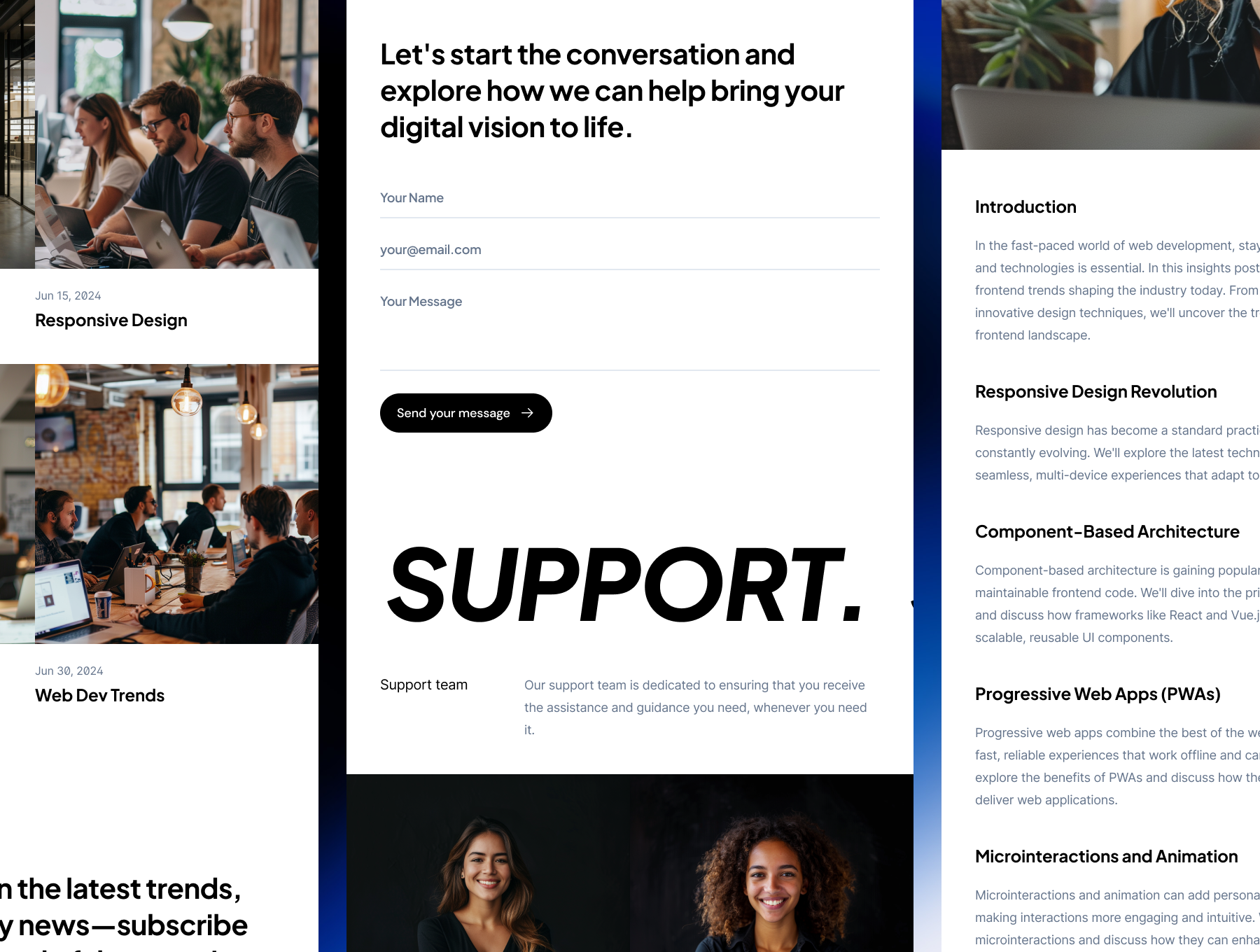 Showcase your work with modern home pages, portfolio layouts, service pages, blogs, and contact forms.