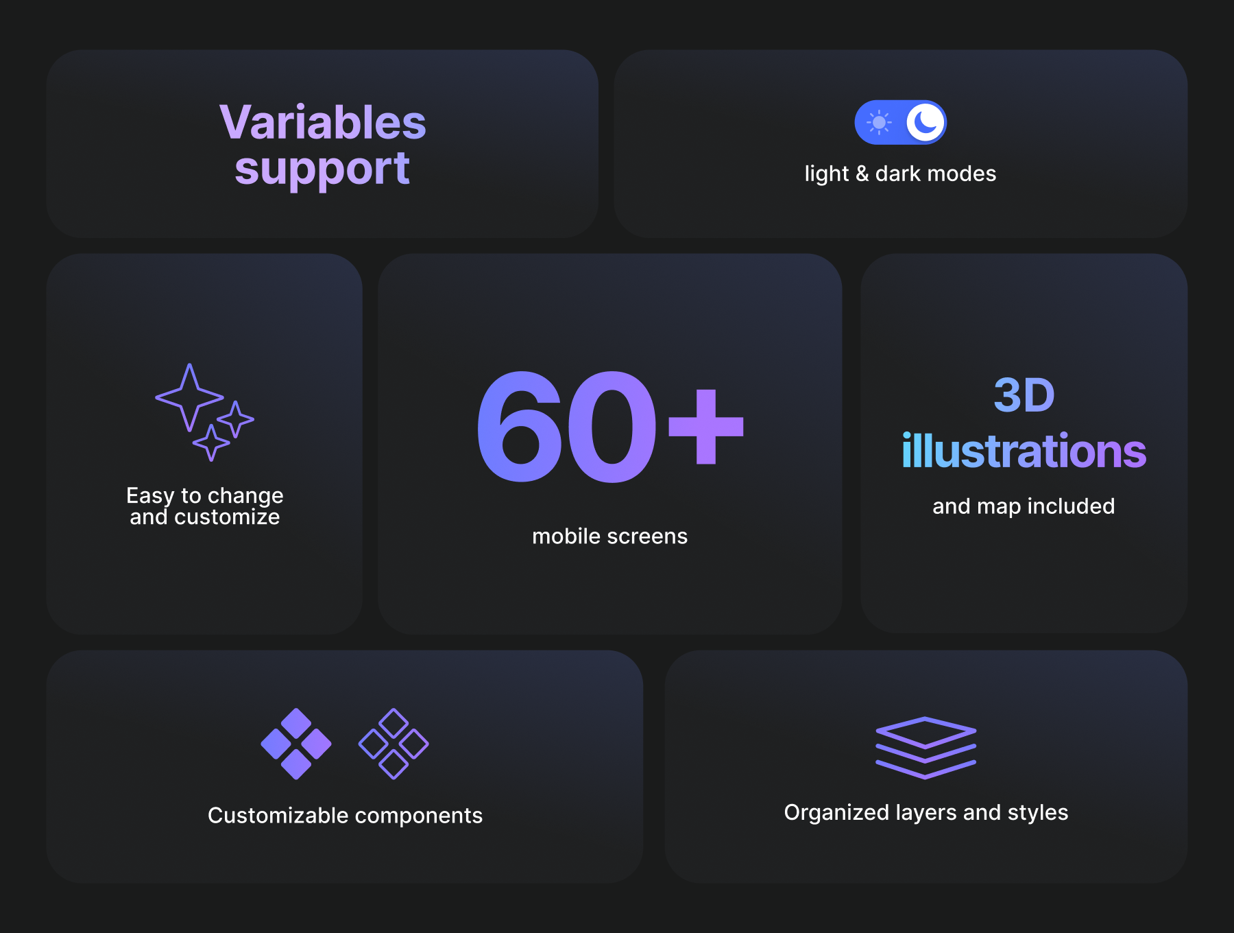 - Includes core UI patterns: buttons, inputs, modals, cards, list items, bottom sheets, and navigation elements.