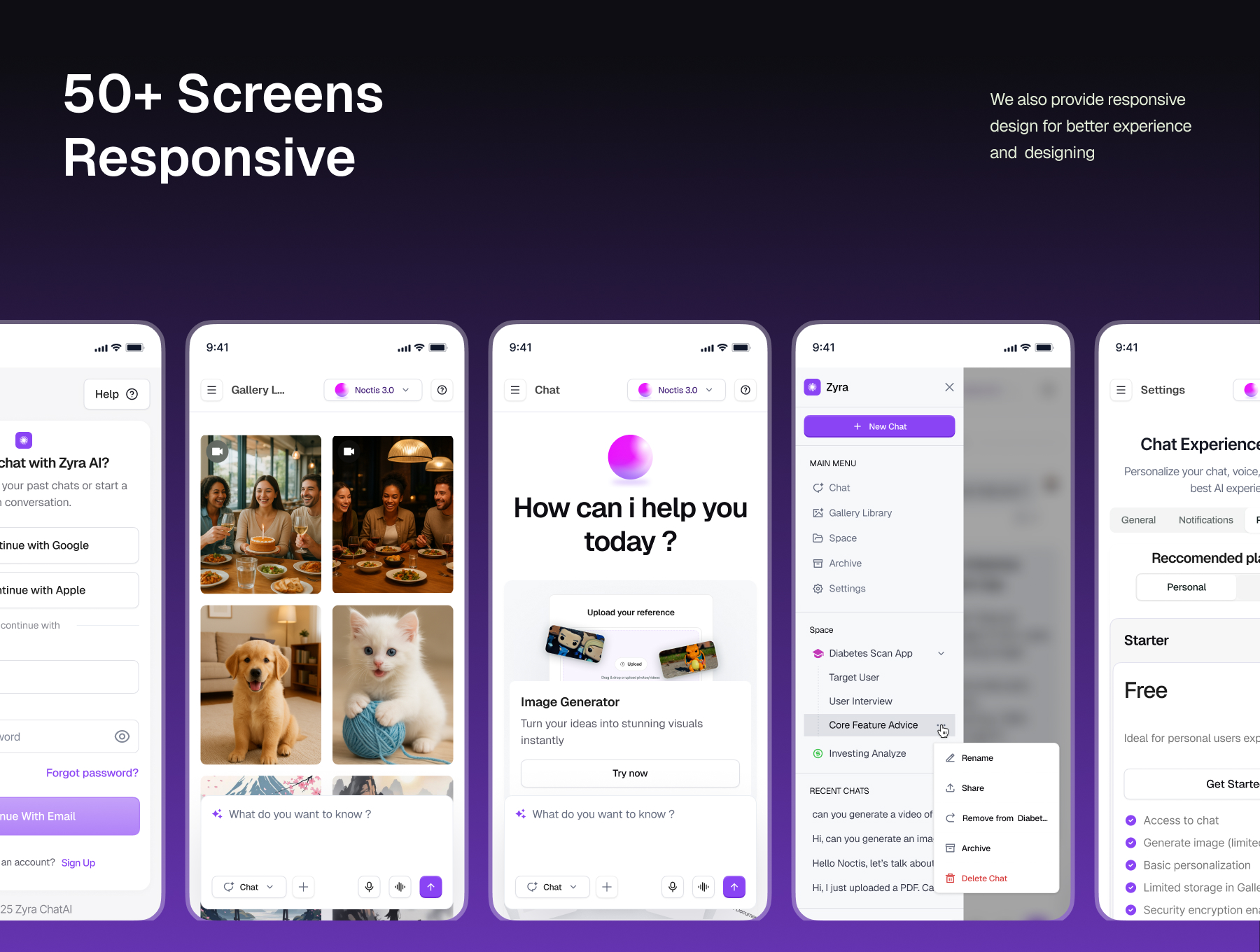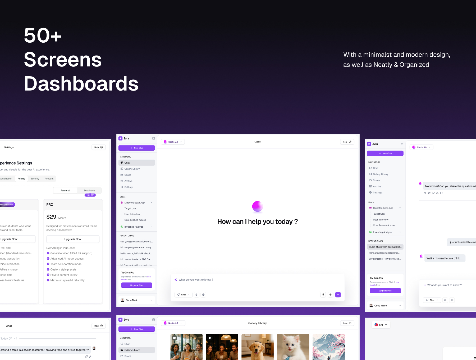 Zyra – Chat AI Dashboard UI Kit is a modern and minimal Figma UI kit designed for building AI chat dashboards, assistants, and productivity tools. It includes 100+ fully editable screens crafted with precision and usability in mind — perfect for AI startups, SaaS platforms, or developers designing smart conversational interfaces.