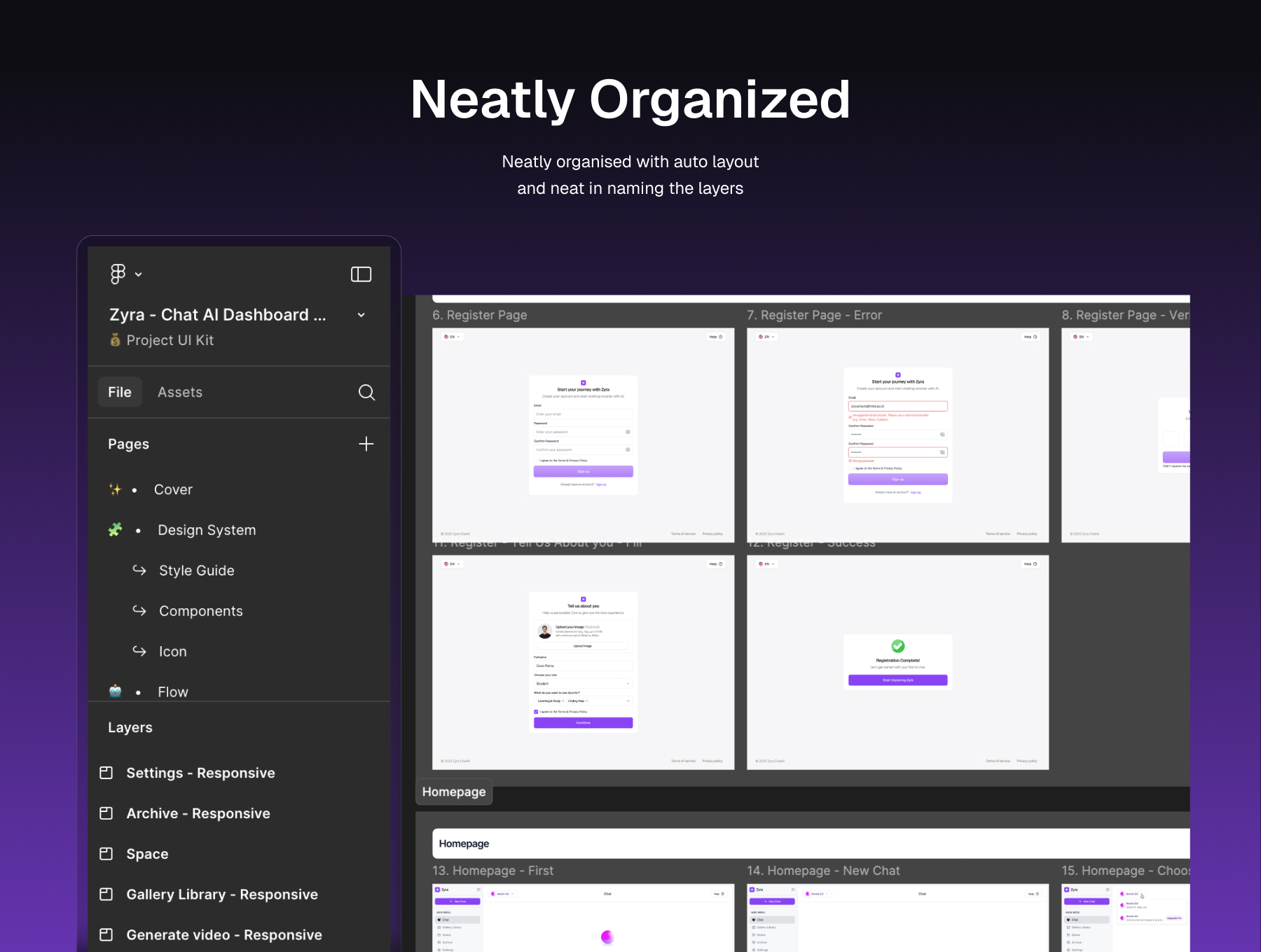 From chat workflows and AI management dashboards to responsive mobile views, Zyra provides a complete visual system ready for customization. Each element follows a global design system, ensuring brand consistency, scalability, and effortless prototyping.